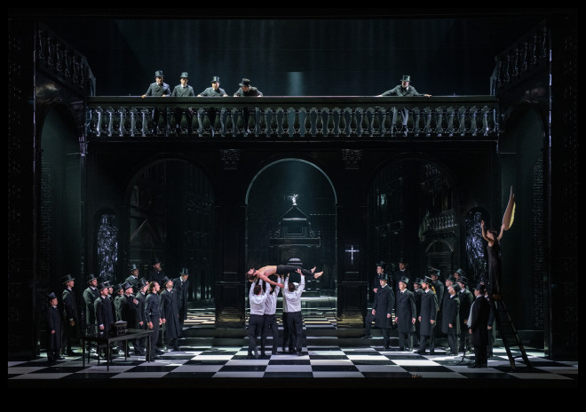 Les décors signés Pierre-André Weitz s'inspirent des architectures et des folles perspectives renaissantes – de Palladio (en particulier celle du Teatro Olimpico de Vicence) plongées dans un camaïeu de noirs goudronnés alors que ses costumes tout aussi sombres – avec complets-vestons, redingotes et chapeaux claques en total contraste avec le rouge des vêtements ecclésiastiques ou de la robe écarlate de désir et rubiconde d'ambition d'Anne, outre la sombre tenue de deuil dévolue à Catherine, renvoient à la fin du XIXᵉ siècle. Mais Py – après quelques réussites brillantes (Les Huguenots, Hamlet) ou plus dérangeantes (Lohengrin, la Gioconda) semble ce soir se répéter et abuser de certains tics : ambiance lugubre et plombée du pouvoir nouveau, abus des plateaux tournants métamorphosant sans cesse l'espace scénique de loggias en façades à la manière du Paris hausmannien en pleine mutation, reproductions envahissantes de trois œuvres hypermaniéristes du Tintoret, d'où émergent parfois dans leur quasi nudité des danseurs ou figurants (notamment en une parade rappelant formellement autant la toile Dante et Virgile de Bouguereau que la chorégraphie du Sacre du Printemps signée Béjart…), sadisme raffiné du supplice de la roue réservé à Buckingham, ajout de figurants surnuméraires, telle cette probable nouvelle maîtresse flanquant le souverain (Jeanne Seymour ?) dès l'annonce officielle de son second mariage. Ce, alors que la conduite d'acteurs, malgré un travail de mise en place minutieux, lors des grandes scènes de foule ou lors des nombreux duos et ensembles se révèle assez faible, par excès de statisme monolithique. Faut-il vraiment en sus, et au comble d'une certaine gadgétisation, faire figurer Henry VIII dressant un vrai cheval – au troisième acte – ou simuler la migration de l'action à l'ultime tableau au château de Kimbolth par une locomotive fracassant, telle la bête humaine, le mur de fond de scène, à l'aune du fameux et dramatique accident survenu à la gare Montparnasse de 1895 ? Voilà d'absconses incongruités !