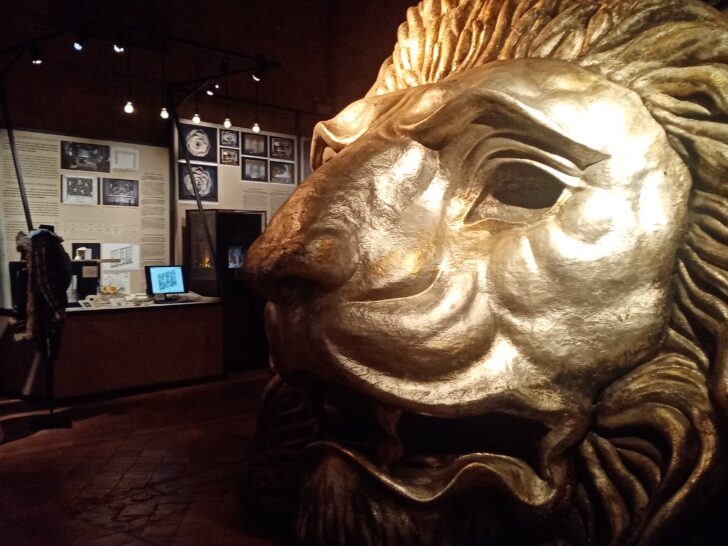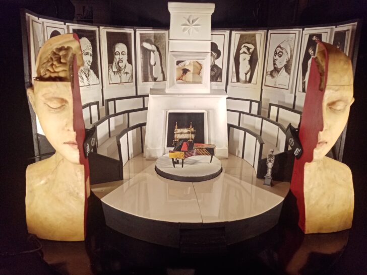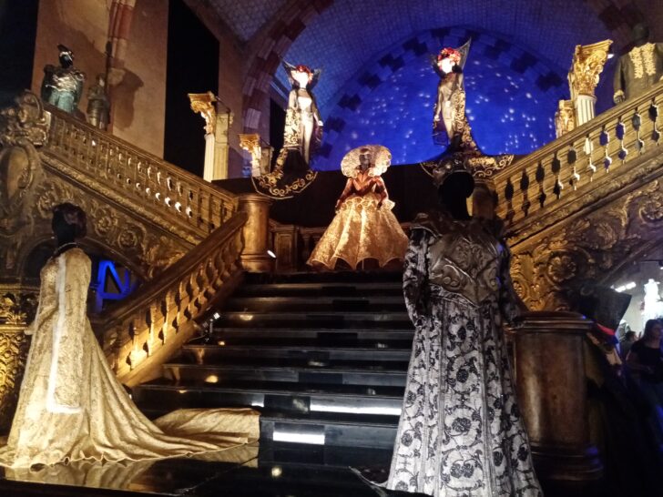 La magie de l’opéra est flagrante dès le début de la visite, le sens du spectacle de la scène lyrique toulousaine étant retranscrite parfaitement dans la scénographie de ce parcours découpé en actes et en scènes, comprenant même une ouverture. L’intérêt du spectateur est alimenté tout au long de sa découverte par la présentation de pièces composant les dernières grandes productions de la maison à commencer par l’Ariane à Naxos sous le regard de Michel Fau en 2019. Le souvenir des productions pour le visiteur qui les a vues est évidemment appréciable même si l’impact des pièces suffit pour briller de tout leur éclat dans le regard neuf d’un visiteur non averti. A chaque étape majestueuse, la scénographie joue sur les éléments habituels de la scène et de la fosse, les présentoirs étant régulièrement les pupitres de l’orchestre.