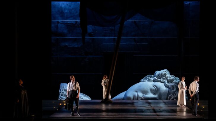 Tout comme l'image, pas de fioritures ni de faste grandiloquent pour un texte en anglais visant la clarté des moyens grâce à des phrases courtes et concises, ainsi qu'une sobriété de dialogues soutenue par une prosodie libre, des harmonies parfois discordantes et de longues mélodies. L'ensemble de la distribution vocale est à la hauteur de l'enjeu, grâce à une projection parfaitement maîtrisée, faisant preuve d'une belle précision dans la diction propre à la langue de Shakespeare même si certains accents restent à parfaire.