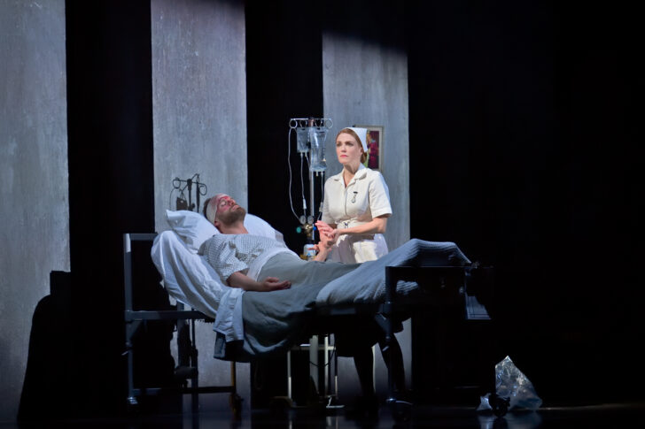 Jugé misogyne par certains à sa sortie, le film est ici réadapté autour du personnage principal de Bess, dans une approche plus féministe de ses doutes et tourments, défendue aussi par la composition vocale de la compositrice Missy Mazzoli. Alors, on retrouve la superbe Sydney Mancasola, d'abord un peu en retrait face à la projection splendide du Jan de Jarrett Ott (c'était Duncan Rock en 2019), puis rapidement d'une finesse lyrique et émotionnelle apte à porter aussi magnifiquement le personnage de Bess qu'Emily Watson à l'écran. Trop vite bloqué dans son lit d'hôpital, le baryton Jarrett Ott déploie à nouveau son chant pour l'opéra contemporain et s'y montre d'une aisance particulière, notamment sur la largeur de la tessiture, sans souffrir d'une partition écrite avec fluidité et peut-être trop limitée dans la dynamique.