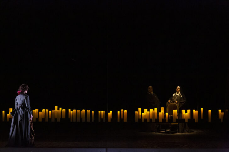 Ce que la mémoire gardera surtout de cette série de Dialogues des Carmélites, ç'aura été la mise en scène de . Pas aussi originale que celle, acclamée, d'Olivier Py (pour preuve la scénographie de la mort de la première Prieure), que celle au finale si spectaculaire de Christophe Honoré, ou encore celle, contestée, de Dmitri Tcherniakov, elle dépasse le statut de son harmonieux classicisme par une science méticuleuse des enchaînements (le plateau qui recule sur l'adieu au monde de Blanche, la lente descente d'une armada de cierges pascals à la flamme vacillante entre les tableaux I et II…), par la pureté de son décor (un mur de briques qui prend particulièrement bien la lumière ; une cage descendue des cintres, une guillotine glissée entre jardin et cour sous une nuit étoilée), par la justesse de ses initiatives : de Croissy qui force Blanche à se coucher sur son corps agonisant ; le « cliffhanger » de l'arrivée muette de Lidoine juste avant l'entracte ; la rampe de lumignons se raccourcissant à chaque décapitation… Sans oublier le coulissement gracieux des « rideaux Carmel » que Delunsch calque au sens propre sur l'affectueuse désignation par Poulenc de ses interludes.