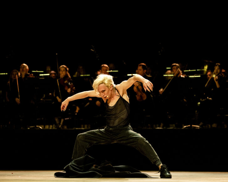 Engoncé dans son manteau noir, François Chaignaud (perruque blonde et micro-lèvres) est déjà sur scène, avec les musiciens, durant l'installation du public. Il avance lentement du fond du plateau jusqu'à l'arrivée, discrète elle aussi, d'Alain Altinoglu, maître d'œuvre de la soirée. C'est lui qui donne le coup d'envoi à une musique qui d'emblée occupe l'espace de résonance, son immersif jouant sur la démultiplication et l'ambiguïté des sources. François Chaignaud n'est ni comédien ni chanteur mais donne à sa façon, corporellement et émotionnellement, à entendre des mots qui surfent sur la vague sonore, s'inscrivent dans le flux orchestral et donnent chair à ce qui est écrit : « Tu nous entends ? Tu sens comme la rue frémit de notre force ? ». La voix parlée fait advenir le chant, longue vocalise éperdue, qui tient davantage de l'improvisation, ou psalmodie cantillée, plus émotionnelle encore, qui cristallise des instants d'une belle fragilité. Chaignaud n'en continue pas moins son monologue, dans un espace sonore très mouvant qui semble épouser les émotions et la tension intérieure du personnage : « la violence sans spectacle qui rentre dans la peau […] la terreur d'être soi », nous dit le très beau texte de Giannecchini. François Chaignaud a quitté son manteau et se met à danser sur une musique dont le registre s'est soudainement éclairé. Il occupe le plateau avec cette énergie et cette stylisation gestuelle qui n'appartiennent qu'à lui : « avec la joie et la rage, / La rage et la joie aux deux pôles de nos vies. ».