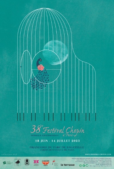 Cette année l’affiche du festival symbolise le magnifique parc de Bagatelle qui, habité par les roses et les paons, accueille le Festival Chopin pour la 38e fois. En y regardant bien, la cage du paon à la rose n’est autre qu’un piano qui renferme les plus beaux attributs de Bagatelle. La porte grande ouverte sur le monde invite à une escapade vers la liberté sous l’œil bienveillant de la lune, fidèle témoin des célèbres nocturnes de Chopin. Chopin reste bien sûr la pierre angulaire de la programmation du festival. Nous y avons invité cette année l’un de ses plus fervents admirateurs.