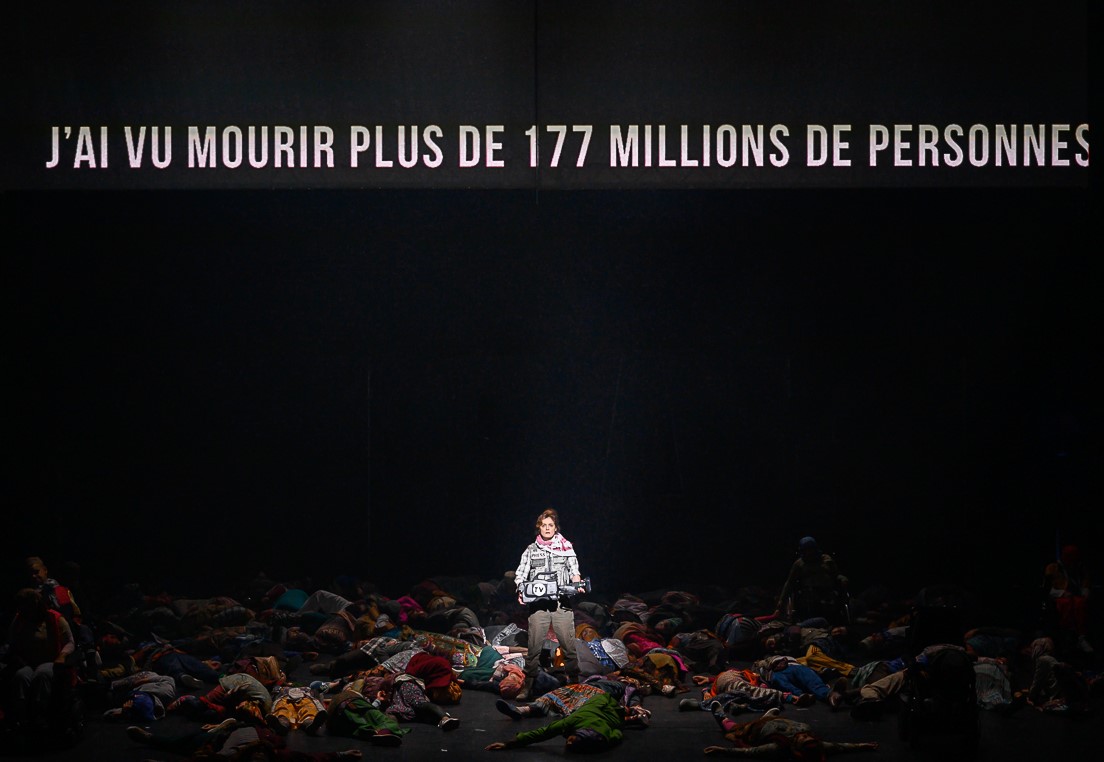 Sur un plateau entièrement nu envahi de brumes chéraldiennes s'avance, face public, un fauteuil roulant, longuement rejoint, dans un silence de mort, par une bonne centaine d'êtres humains de tous formats (au Festival de Merida, en 2020, il y en avait 450 !). Auparavant, le spectateur, en s'installant confortablement dans son fauteuil, aura pu lire, sur des écrans abaissés sur la scène, quelques extraits d'interviews, comme sur les chaînes d'infos en continu : « L'amour c'est la vie. Et la guerre ? il faut arrêter la guerre», « l'amour c'est s'écouter les uns les autres, sans jugement », « L'amour est… un couple. La guerre est… un monde de fous. Le chef d'orchestre apparaît ensuite. Ses bras s'élèvent lentement à une hauteur inaccoutumée. Lorsqu'ils s'abaissent soudainement, tous les corps tombent avec fracas au sol. Sur les premières notes de musique un bandeau déroule alors les états d'âme d'une journaliste dont l'on comprend très vite que le témoin privilégié qu'elle est va dérouler le fil narratif de ce nouveau Samson et Dalila : « J'ai vu mourir plus de 177 millions de personnes lors de conflits armés, de guerres civiles ou de religions, tout au long de l'Histoire », « J'ai vu comment des peuples frères s'entretuaient au non de dieux absents », « J'ai vu comment vous restiez indifférents face à la barbarie qu'à maintes reprises je vous faisvoir. » « Maintenant je vais vous montrer comment la haine se perpétue. » Munie de sa carte de presse, elle s'immiscera partout, sur les places publiques, dans les prisons, et même dans l'intimité des puissants.