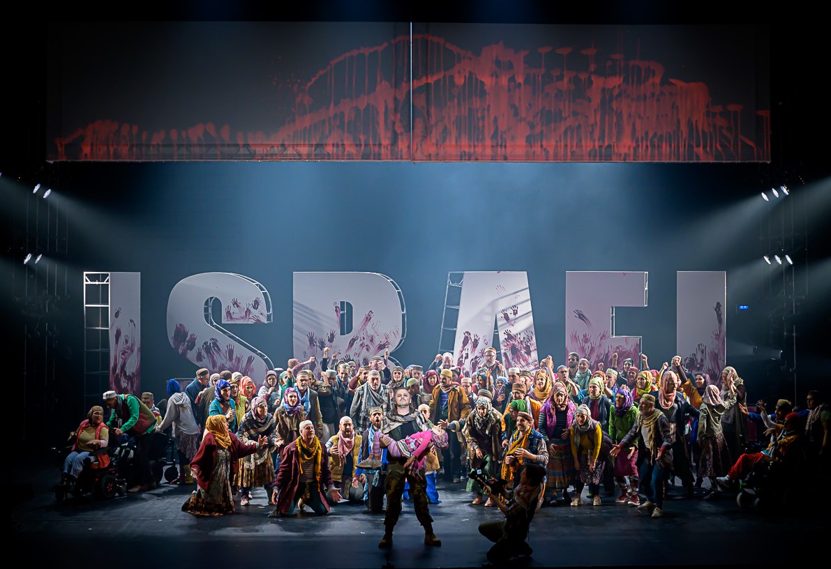 Vaste programme, que Paco Azorín mène, avec des moyens scéniques très sobres, jusqu'au terme d'une représentation suffocante d'intensité. Hormis les panneaux relayant de façon télévisuelle les différents lieux de l'action, le décor n'est constitué que de six lettres, gigantesques, manipulées dans toutes leurs configurations : celles du mots ISRAEL, éclaboussées de sang et de traces de mains. Entre deux murs latéraux de projecteurs, un tulle d'avant-scène et un écran en fond de plateau, jeu d'orgues mouvant et direction d'acteurs exceptionnelle font le reste. Il n'y a presque rien. Mais il y a tout.