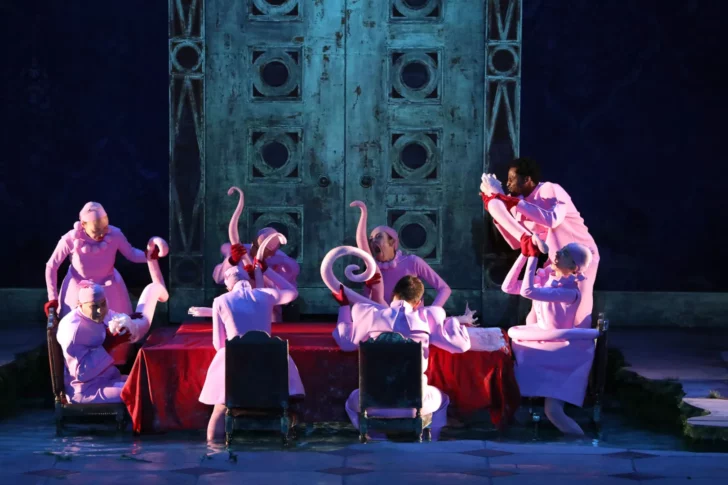Un tel sujet se prête bien évidemment à de multiples lectures, philosophiques, sociétales et psychanalytiques sur l'incommunicabilité, l'altérité, voire le déterminisme social. Point de telles arguties pour Emma Dante qui préfère s'en tenir à une lecture au « premier degré » au plus près du conte, en soulignant à l'envi le coté merveilleux, fantasmagorique, maléfique et magique, dans une mise en scène haute en couleur, ironique, imaginative, parfois grotesque, mais toujours chargée de sens et d'émotion, fortement inspirée de Walt Disney, mâtinée de surréalisme pop à la manière de Ray Caesar pour en exalter l'aspect intemporel et la modernité. Car voilà bien une lecture qui ne manquera pas de faire hurler les grincheux dès le premier tableau lorsque l'héroïne pénètre sur le plateau en fauteuil roulant dans une scène hautement symbolique qui pourrait à elle seule résumer toute la problématique du conte puisqu'il s'agit d'une créature hybride, moitié femme, moitié monstre, affublée de tentacules en lieu et place des membres inférieurs, appendices qui l'empêchent de marcher et qui devenus inutiles dans notre pauvre monde seront goulument dévorés par les humains lors d'un irrésistible festin à l'acte II : Jambes ou tentacules ? « That is the question… »