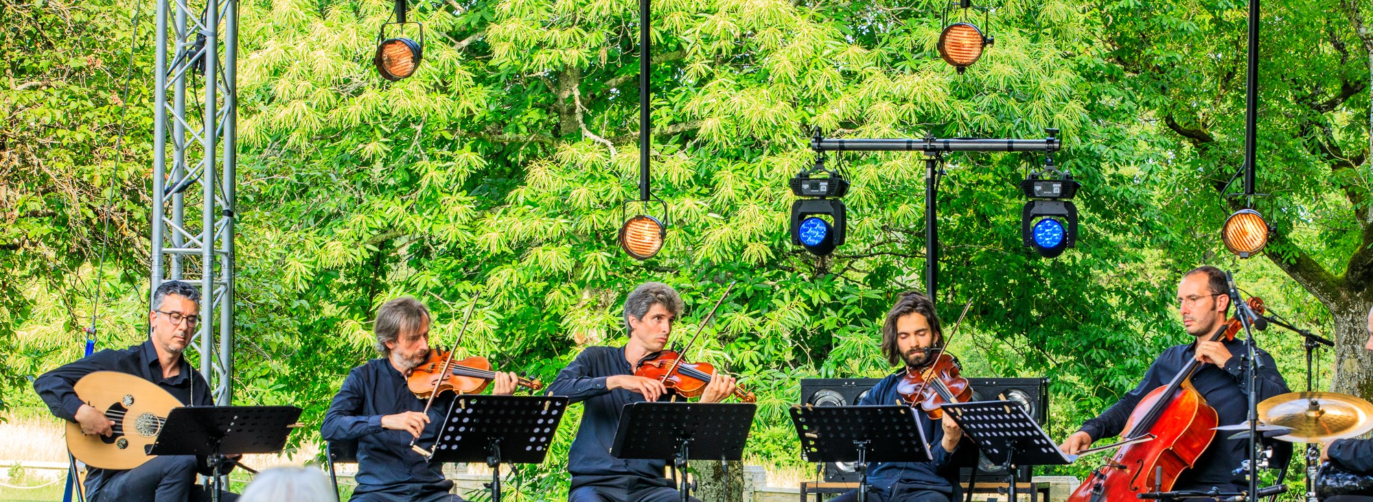 Le très voyageur Quatuor (français) Béla et le Duo (palestinien) Sabîl, qui se sont rencontrés en 2012, se retrouvent au Jardin, sous les tilleuls de Noirlac, pour une rencontre entre l'essence de la musique classique et celle de la musique arabe. Jadayel (Tresse) propose, non une complétude, mais une infusion réciproque en profondeur, qui n'est pas sans évoquer Passages de Philip Glass et Ravi Shankar. Superstar de moult concerts, comme on l'a vu encore récemment à Vézelay, le oud est aussi celle de Jadayel. Toutes deux d'une évidente séduction, les compositions d'Ahmad al Khatib alternent avec celles de Frédéric Aurier (premier violon des Béla). Aurier est l'auteur d'un superbe Lamento inspiré pour le oud de la façon dont Dowland écrivait pour le luth. Al Khatib séduit avec les vingt minutes de sa Trilogie du Maqam, avec Gnaoua qui permet à Aurier de vanter avec humour les charmes ambigus de la mesure à six temps, laquelle, dit-il, présente, comme la bourrée, l'avantage de pouvoir être jouée à deux fois trois ou trois fois deux ! Mima (Le Hâvre) expose dans un rythme de berceuse les charmes du Home sweet home mais aussi la mélancolie qui s'y rattache lorsqu'on est forcé à la fuite. La musicalité des Béla infuse à merveille cet universalisme musical dynamisé par la darbouka et le bendir de Youssef Hbeisch. Quatre-vingt-dix minutes d'une prégnante nostalgie d'un monde idéal à construire.