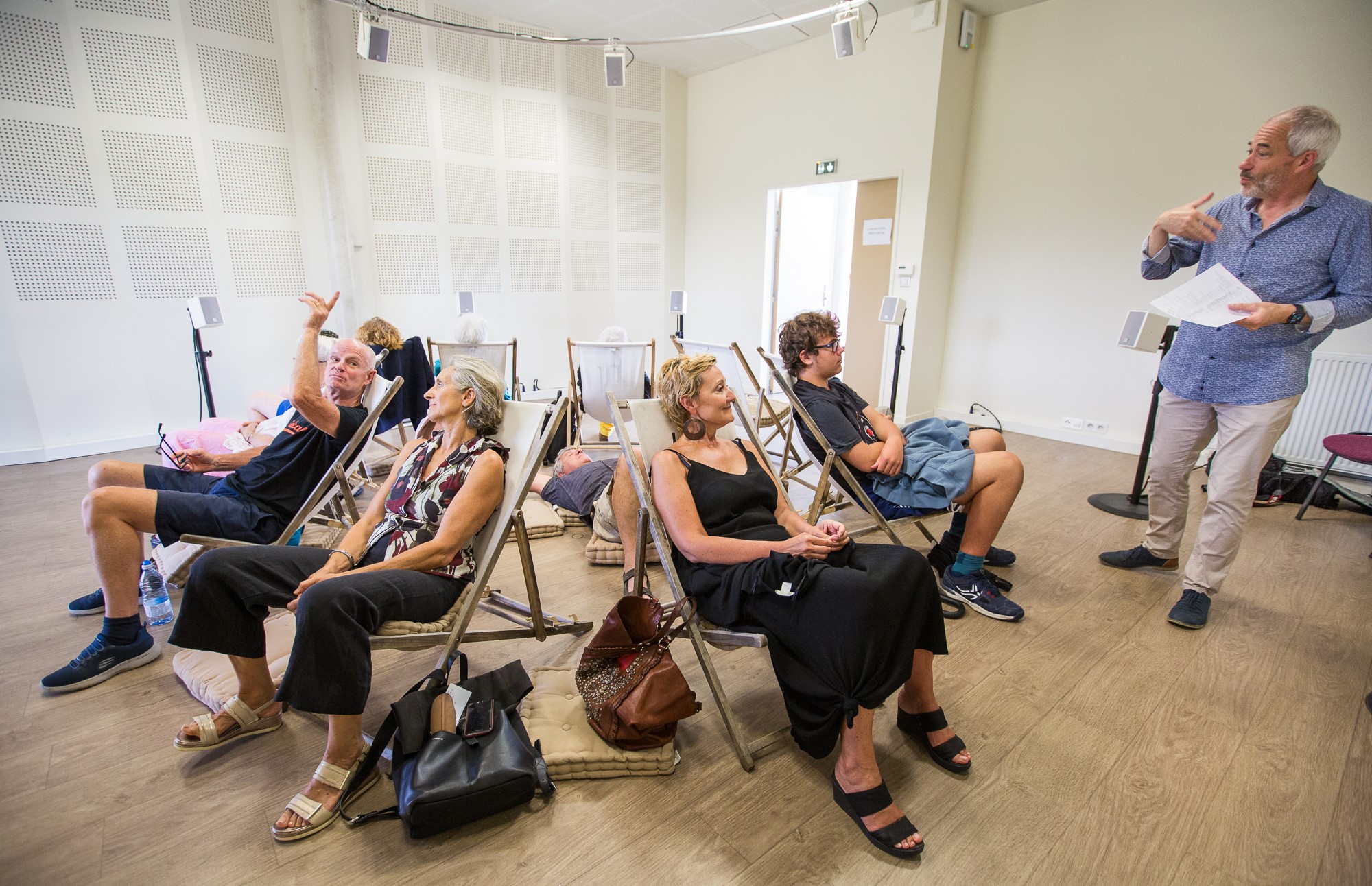 Dans le studio 2 de la ferme de Noirlac, Jean-Christophe Désert, le coordinateur des ateliers sonores, a minutieusement mis au point une immersion sonore d'une heure qui emmène en chaise-longues une dizaine de privilégiés pour un voyage entre l'animal et l'humain : soit un face-à-face entre des chants d'oiseaux captés dans le bocage de Noirlac et les notes sorties de la plume de compositeurs captés dans l'histoire de la musique. La vraie caille et celle de Beethoven, la vraie poule et celle de Rameau, le vrai rossignol et celui de Vivaldi (37 extraits au total) se font entendre successivement ou simultanément par le truchement de deux ceintures d'une dizaine de haut-parleurs. Jean-Christophe Désert est ce maestro tout de bienveillance paisible qui répond aux nombreuses questions de ses élèves d'un jour.