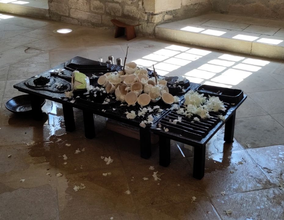 « Artiste-exploratrice depuis le champ de la danse contemporaine », Catherine Contour, soutenue par les tenues jouées ou soufflées du saxophoniste Bertrand Gauguet, propose Infuse, une performance de trente minutes qui en durera le double. Infuse déroule en temps réel la cérémonie du thé : sa minutieuse confection, puis sa lente distribution, par une assistante au sourire bienveillant, à chacun des trente convives réunis dans la Salle capitulaire du Cloître, dans des petits bols culbutos confectionnés par une céramiste à partir de son propre coude. Au terme de la chorégraphie invisible de cet éloge de la lenteur, Catherine Contour ramasse les bols, dont l'empilement progressif contre sa poitrine édifie une sorte de colonne vertébrale. Las ! Tandis qu'elle repart chercher les bols manquants, la colonne de bols, posée non sans difficulté sur la table cérémonielle, laisse choir deux bols qui se brisent. Comme dans Jeanne Dielman, tout semble se dérégler soudain : la théière est renversée, les bols sont arrosés par l'artiste d'une eau passant outre les frontière de la table-paysage qui, jusque là, semblait conçue en rempart d'éventuelles catastrophes. Enfin une pluie de fleurs rageusement démembrées achève de mettre à sac un dispositif à la zénitude annoncée en préambule (« pas d'armes… pas de hiérarchie », avait prévenu Catherine Contour). Infuse se termine donc, à la stupeur générale, sur un paysage d'apocalypse qui n'est pas sans interroger. L'artiste nous confiera le lendemain, au terme d'une seconde performance plus en phase avec son ambition originelle, avoir été pressée par le temps, mais que le « tsunami infusatoire » figurait bel et bien dans le scénario d'une démarche qui ambitionne de rappeler à l'homme que la catastrophe peut ternir la plus savante des harmonies.