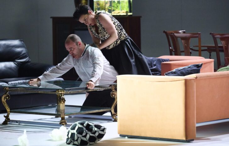 Aussi foisonnants que disparates, les éléments du décor unique que conçoit avec l'efficacité des lumières de Michael Bauer, suggèrent les trois pièces de l'appartement de ce couple d'italiens « moyens » : sa chambre à jardin, les lits superposés des enfants à cour (rappelons que la Donna les a tués avant de se suicider), avec une trottinette, des jouets et des peluches qu'elle serre sur son cœur ou qu'elle lacère avec son couteau. Plusieurs canapés, un buffet ancien, deux postes de télévision, un aquarium occupent le centre du plateau ainsi qu'un grand miroir en fond de scène censé refléter les actes de violence et la monstruosité des gestes vus. Dans une mise en scène sans débordement où le sang tache les mains du couple et le corps de la Ragazza (prostituée), tombant sous les coups de l'Uomo (il l'attache sur les tenants en bois des lits jumeaux comme le Christ en croix), la précision et l'efficacité de la direction d'acteurs opèrent à travers une stylisation des gestes, comme dans cette première scène sado-masochiste conduite par la Donna, ceinture et cravate en main, dont la musique se charge de faire entendre toute la violence.