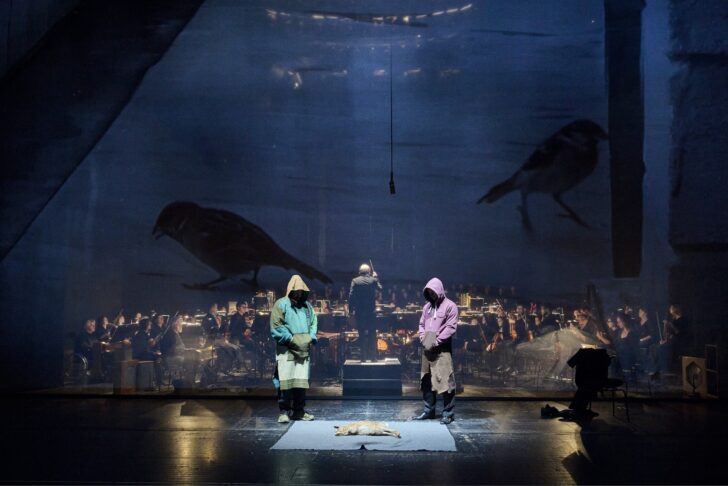 Pendant l'essentiel de la journée, au contraire, on assiste à une mise en espace(s) fluide, un peu trop agitée dans la partie en plein air : Mahler souligne avec une insistance contre-productive la suspension de la coupure entre scène et salle, qui n'est pas franchement une invention récente. Il y a une certaine beauté dans le premier tableau, où le proscenium est seulement orné d'un lièvre mort, animal totémique de la peur qu'expriment les premiers mots de l'opéra. Dans la suite de la scène, cet animal aura droit à un enterrement, plein de la compassion franciscaine pour les êtres les plus humbles. La mise en scène, hélas, ne fait rien pour rendre compréhensible la monumentalité pour le moins maladroite des deux dernières scènes (stigmates et mort).