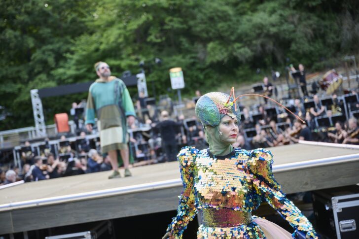 La metteuse en scène Anna-Sophie Mahler a vu grand pour les huit heures que dure la représentation. L'Opéra de Stuttgart ne lui suffit pas : après les deux premiers tableaux, le public se met en route pour rejoindre les hauteurs du Killesbergpark, magnifique parc urbain, pour les trois tableaux suivants, avant de redescendre à l'Opéra pour les deux derniers. On suit donc l'opéra d'abord avec l'orchestre sur la scène et les chanteurs sur le proscenium, puis en montant les pentes du parc sous forme enregistrée, ensuite sur la scène en plein air du Killesberg (avec l'orchestre lui aussi présent, mais naturellement avec amplification), et enfin à l'Opéra avec l'orchestre en fosse : entre les différentes parties, on oublie un peu ce qu'on est venu faire là. La valeur ajoutée est surtout le chant des oiseaux qu'on entend à travers les écouteurs fournis et autour de la scène en plein air, mais c'est bien peu pour un tel déploiement de moyens.