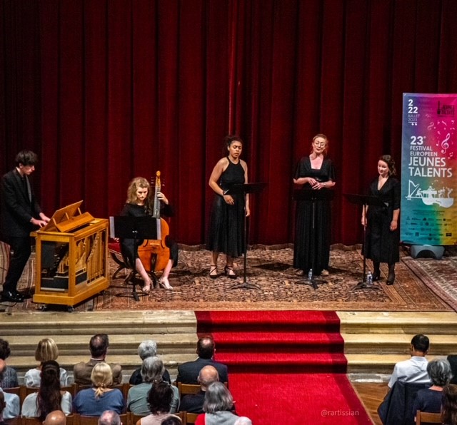 Parmi les concerts extrêmement divers qui composent la programmation du Festival Jeunes talents 2023, celui-ci est placé sous le lointain patronage du Concerto delle donne, un trio de chanteuses fondé à la cour de Ferrare en 1580. Et de fait, les continuistes Maylis Moreau à la viole et Pierre Quiniou à l'orgue positif, s'ils sont indispensables dans ce répertoire baroque, et s'y montrent impeccables, ne se font pas remarquer de la soirée, hormis le second pour quelques mots d'introduction. L'intérêt ce soir est surtout dans la découverte de ces trois voix féminines, et dans le déroulé de ce programme allant de l'Italie à la France par le truchement de la musique religieuse.