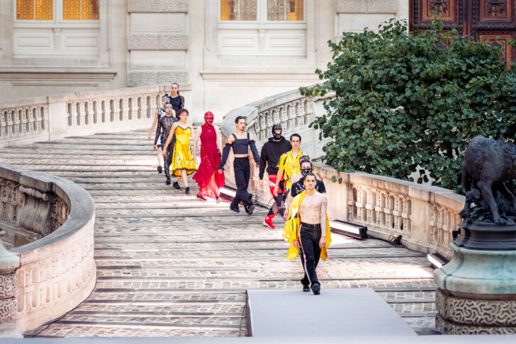 La pièce trouve ici une dimension nouvelle et fait miroiter d'autres facettes que lorsque nous l'avions vu à Orléans. La spectaculaire double rampe en fer à cheval de cette cour Napoléon III est en effet idéale pour faire descendre les 22 danseurs du CCN-Ballet de Lorraine jusqu'au plateau situé en contrebas. L'effet est saisissant quand ces jeunes danseurs, habillés par la créatrice Christelle Kocher, alias KOCHÉ, défilent comme sur un catwalk, avec des épaulements et un déhanchement que l'on retrouve habituellement chez les mannequins. Il y a quelques jours, c'était sur le Pont-Neuf tout proche que Pharrell Williams faisait défiler les modèles de Louis Vuitton…