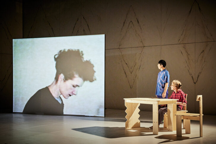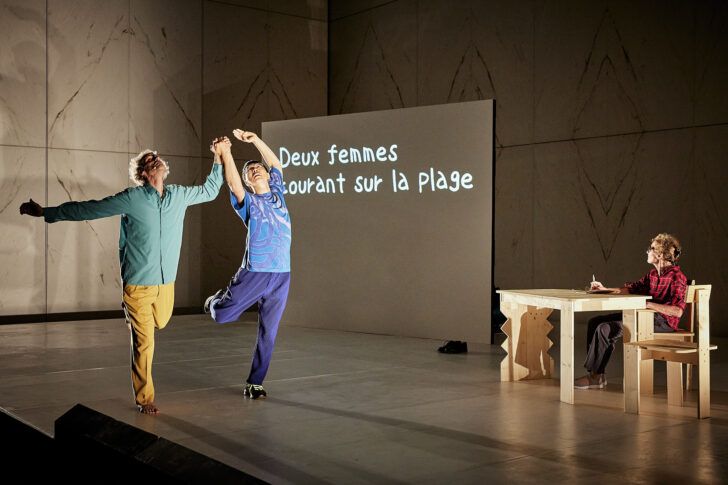 Le spectacle prend la forme d'une conférence loufoque où le parcours de chacun est exposé, soutenu, par moments, par des extraits vidéos projetés sur un grand panneau occupant tout le côté jardin de la scène. Des spectacles sont diffusés, des photos de famille, des poèmes (japonais ou français). À jardin, le trio prend place autour d'une table et s'en détache pour danser ou pour marquer un pas de côté gracieux, sans rapport apparent avec le discours. Ce dispositif n'est pas sans rappeler certaines scènes de Senses du cinéaste Ryusuke Hamaguchi. Les paroles sont posées, les moments chorégraphiques distillés avec justesse, la présence de Martine Pisani irradie : des haïkus sur l'écran à la construction patiente d'une minuscule table, visseuse en main, tout est délicat, pesé, simple et surtout, vrai.