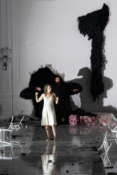Rien à voir avec la vraie force agissante de l'œuvre, la Junon volcanique d'Emily D'Angelo, formidable méchante de comédie en costume gothique, avec une voix qui brise tous les obstacles. Elle malmène Iris (Jessica Niles), manipule Ino (Nadezhda Karyazina, au timbre somptueux) en en faisant une sorte de robot privé de sa personnalité : un des grands mérites de la soirée, grâce au metteur en scène et à la collaboration enthousiaste des chanteurs, c'est qu'elle nous fait prendre conscience à quel point le livret de William Congreve, écrit près de 40 ans plus tôt et adapté pour Haendel, est une formidable machine théâtrale. Guth s'emploie avec gourmandise à tirer parti de tout ce que la musique et le livret lui offrent, entre autres grâce aux formidables décors de Michael Levine, qui varient au fil des scènes autour d'une configuration commune de grande salle bourgeoise. Il suffit de voir Semele, au premier acte, pendant ses noces avortées avec Athamas, attirée irrésistiblement vers une unique plume noire, en contraste avec le blanc des murs et des costumes : la plume suffit à évoquer l'aigle qu'est Jupiter, et la suite du spectacle ne se privera pas d'évoquer les relations troubles entre l'humain et l'animal.