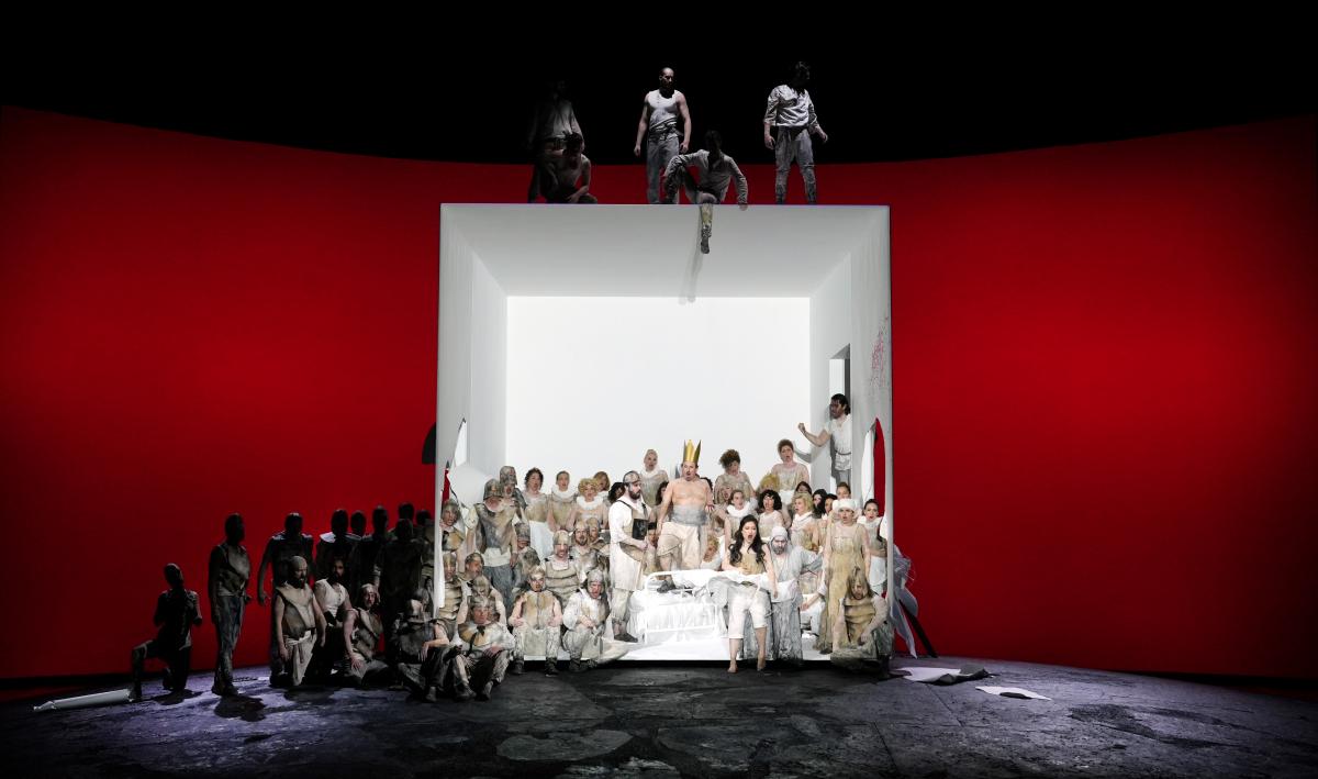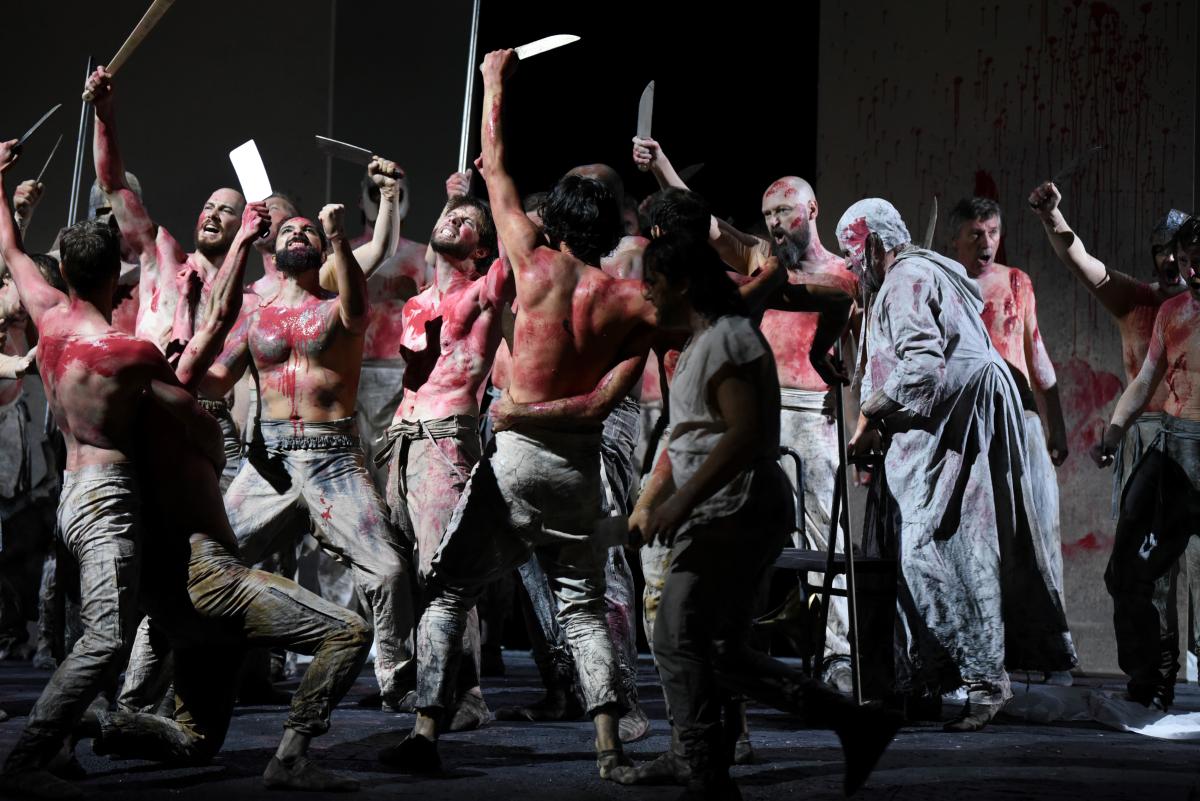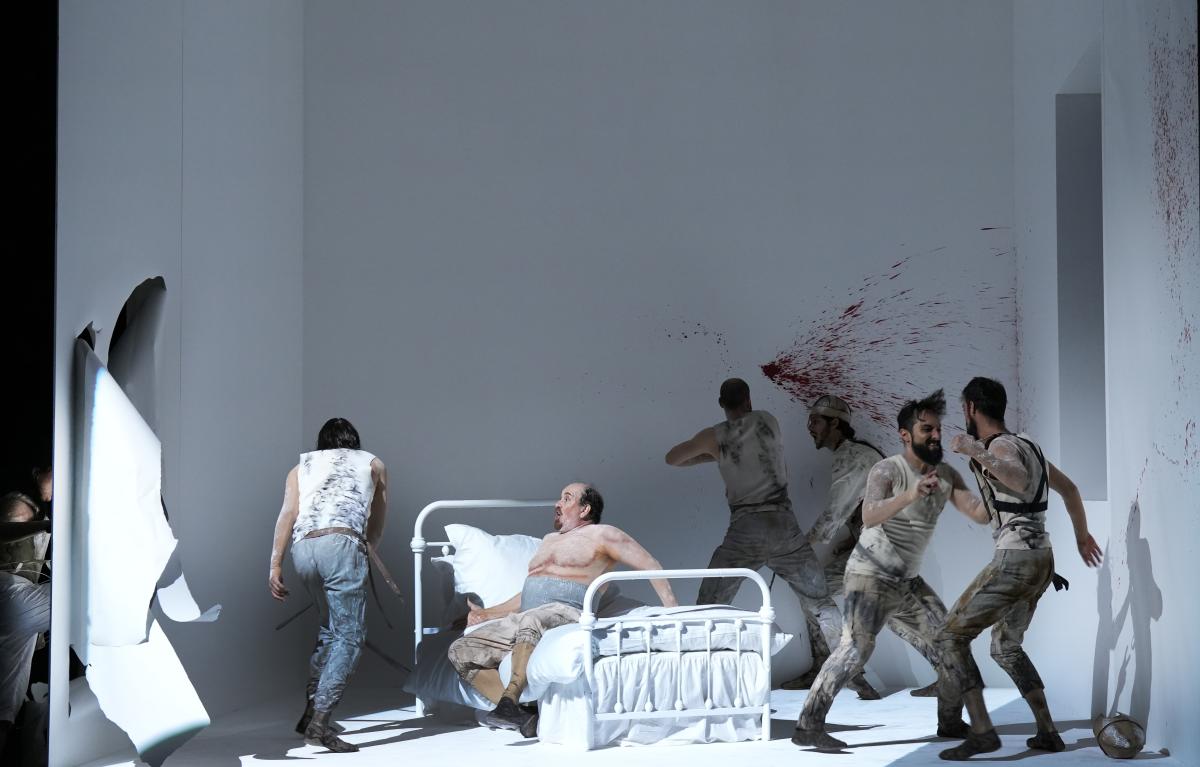 Le rideau se lève sur le sommeil de quatre hommes couchés à même une sorte de toit du monde. Surgit, comme du fonds de temps immémoriaux, une armée virile et musclée qui convie les dormeurs à la dive bouteille avant de les entraîner dans un bain de sang. Ce décor très neues bayreuth accueillera une chambre (un cube éblouissant dont l'immaculé ne le restera pas longtemps), les colonnes d'un château, un cimetière. Les lumières d'Alex Brok flattent la stylisation intemporelle de cette scénographie conçue par Christof Hetzer, simple et esthétique, et surtout, d'une très intéressante capacité victimaire : les murs, traversés par les épées et les corps, sont éclaboussés du sang des combattants, des victimes (longue scène de scarification de Silva par Carlos). On se croirait dans 300, le film de Jack Snyder. Les déplacements du chœur comme l'infiltration des figurants bénéficient d'un travail chorégraphique assez poussé et l'ensemble a de l'allure, que l'on combatte ou festoie. Mais, curieusement, Lotte de Beer, en lâcheuse de sororité, après avoir finement évoqué, au moyen d'envols de robes déjà bien mises à mal, les viols militaires qui sont l'ordinaire des mercenaires, ne fait pas grand-chose d'Elvira. Elle semble ne pas non plus voir combien le déambulateur de Silva compromet franchement l'esthétisme de sa vision, ce dernier trônant même entre les cadavres au tomber de rideau ! Du coup, son Ernani sang pour sang, même s'il recueille un grand succès auprès du public endimanché et poli de Bregenz, ne va pas crescendo et passe lui aussi, à l'instar de ses prédécesseurs, à un cheveu de la franche réussite.