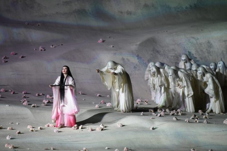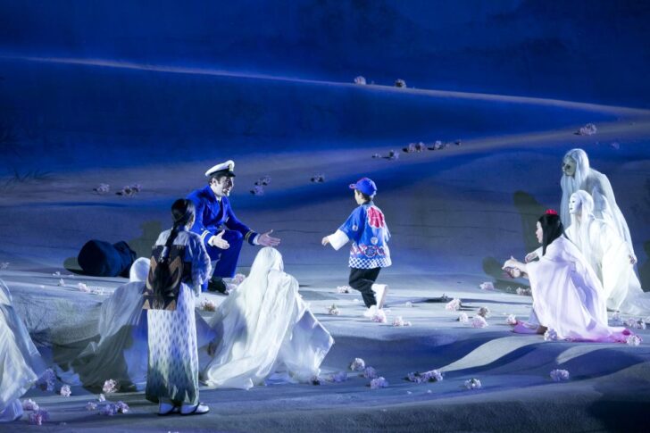 Les pliures de la feuille surlignent les chemins obliques empruntés par les personnages dont les vêtements aux couleurs très primaires (bleu pour Pinkerton, jaune pour Sharpless, rose pour Kate…) tranchent avec le blanc des Ottokés, ces âmes des ancêtres ressuscitées grandeur nature dès l'arrivée des derniers spectateurs. Ces présences fantomatiques, qui glissent au ralenti sur le papier dont elles semblent se détacher, seront de toutes les scènes-clés : ce sont elles, au final, qui tendront à Cio-Cio San le tantō paternel du seppuku. Une vidéo fait apparaître le Bonze furibond en bouche hurlante, une équipe de porteurs immergés jusqu'à la taille amènent un Yamadori démesurément grandi, Goro plonge vraiment dans le lac (succès garanti pour cette figure presque obligée à Bregenz) : ces rares moments où le spectaculaire attendu par les spectateurs reprend ses droits n'oblitèrent pas la constante satisfaction esthétique du spectacle. On s'enchante au I de l'arrivée en apesanteur des geishas autour de Butterfly (les costumes d'Antony McDonald sont des merveilles de goût), au II des chorégraphies des Ottokés rappelant ses origines et son destin à la transfuge, au III du rêve de Butterfly, de l'arrivée sur l'eau du bateau de papier démultipliant celui façonné plus tôt par son enfant. Même quand Butterfly est seule au centre de la feuille de papier, prostrée comme un papillon cloué dans sa boîte, le spectacle garde toute sa force.