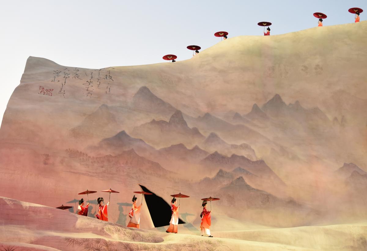 A la vue de cette Butterfly à la facture presque classique et, ses dernières secondes mises à part, sans réelle surprise, on réalise combien les décennies ont filé depuis les images sophistiquées de La Femme sans ombre avec lesquelles Andreas Homoki fit en 1992, au Châtelet, une entrée fracassante dans le sérail des metteurs en scène qu'on aurait envie de suivre. En 2023, Homoki et son décorateur Michael Levine ont fait le choix de raconter Madama Butterfly en traçant à l'encre de Chine le triste destin de la geisha puccinienne sur la pente froissée d'une feuille de papier soumise à un des plus beaux dialogues entre jeux d'orgues et vidéo (Franck Evin/Luke Halls) jamais vus à Bregenz. Sur cette feuille comme arrachée à une collection d'estampes japonaises, jetée ainsi qu'une bouteille à la mer sur le lac, on peut déchiffrer sous le pastel, paysages, haïku et sceau rougi, tous symboles d'un Japon évanoui, aujourd'hui bien ancré dans une modernité mondialisée, et incarnée, dans le livret de Giacosa et Illica, par l'impérialisme américain, dont la pénétration est immédiatement prise au sens propre par la mise en scène : Pinkerton entre dans le décor immaculé de Cio-Cio-San en le déflorant, suivi de la longue érection vers le ciel du drapeau yankee. On ne saurait poser mieux les enjeux du chef-d'œuvre de Puccini.