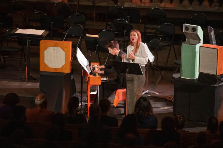 L'acoustique de la Collégiale de Briançon, où se déplace chaque année le festival, est plus problématique mais peut s'avérer flatteuse pour certaines pièces jouant avec la résonance. C'est le cas de Stèle, une œuvre fascinante de Gérard Grisey pour deux grosses caisses qui profite de la réverbération des lieux. Sur l'une des peaux est tendue une cordelette munie de petites boules qui font vriller le son comme le timbre sous la caisse claire. Du frottement à la déflagration, Grisey sonde la richesse de ces beaux instruments dont les sonorités monochromes et ritualisantes ne laissent pas indifférent. Si la réverbération excessive n'autorise pas la clarté du texte des trois mélodies de Debussy que chante avec beaucoup d'élan Élise Chauvin accompagnée par le pianiste Alphonse Cemin, on perçoit beaucoup mieux les mots de Philippe Leroux dans sa pièce Un lieu Verdoyant (1999) écrite en hommage à Gérard Grisey, en raison sans doute du traitement quasi instrumental de la ligne vocale et des libertés prises avec la prosodie. Ce sont les ondes Martenot de Nathalie Forget, installées sur le devant de la scène, qui remplacent le saxophone soprano, doublant la voix d'Élise Chauvin ou jouant avec elle dans un espace toujours mouvant.