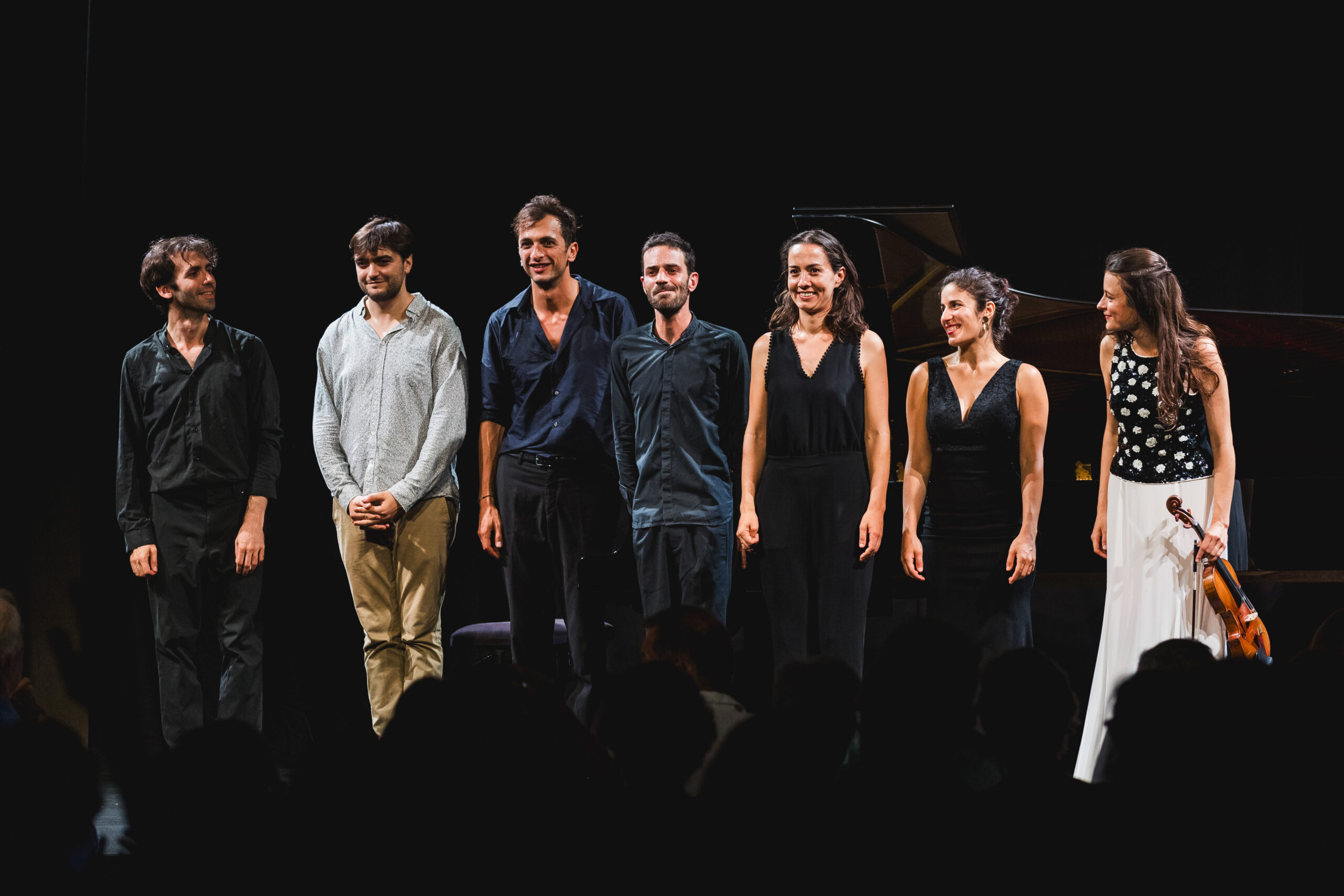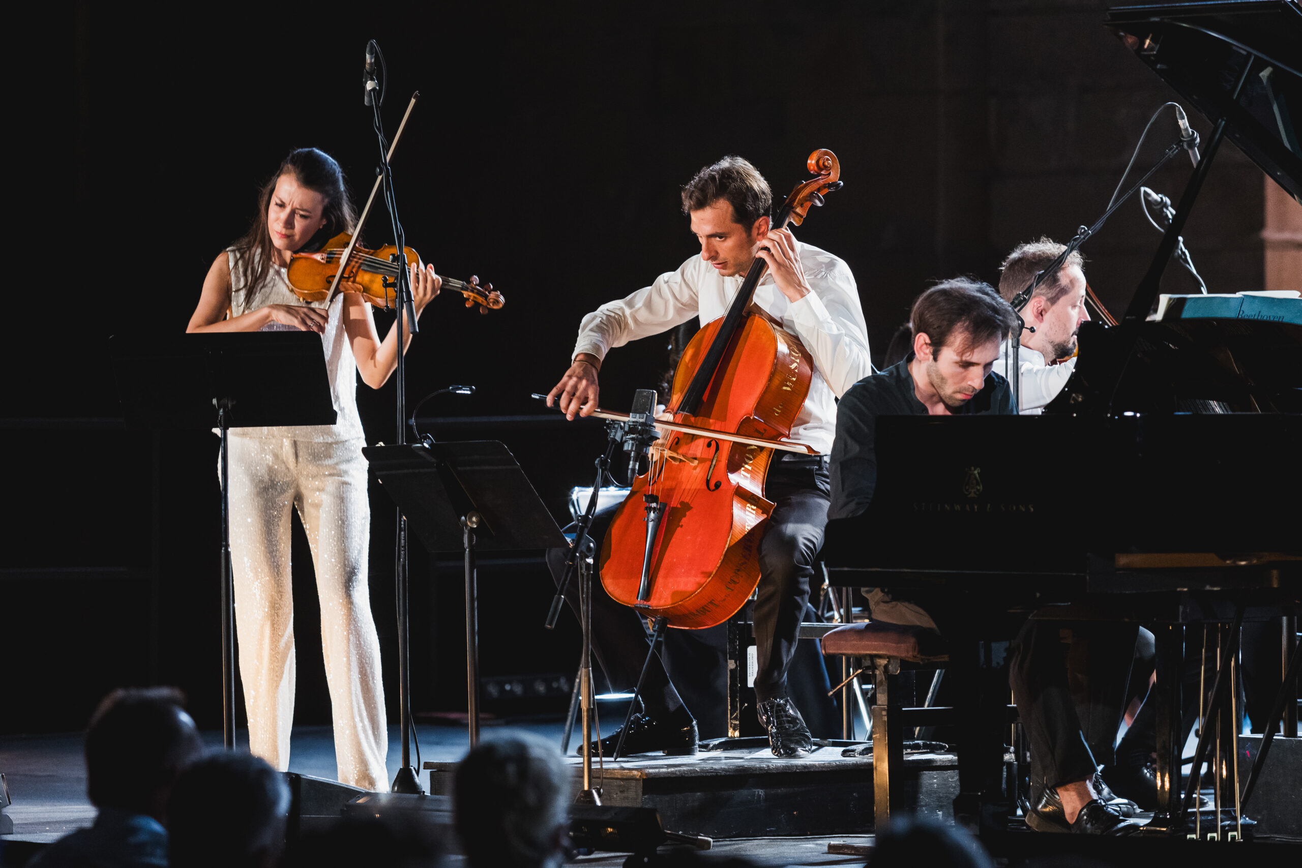 Une larme de Rossini pour violoncelle et piano met en avant un autre pianiste et ami de la bande, Adam Laloum, également à l'origine d'une inédite transcription violon-piano à partir de la version piano-voix de la Liebestod du Tristan de Wagner, qui permet encore de profiter de l'intégrité du jeu de Charlotte Juillard, plus tendre et plus réservé que celui de Liya Petrova, différente de style mais magnifique de ferveur pour clôturer la première partie du concert avec à la place d'une Carmen Fantaisie de Waxman d'abord prévue, le plus célèbre Introduction & Rondo Capriccioso op. 28 de Saint-Saëns, en compagnie de Kantorow. Après le Quintette de Schubert qui troque l'altiste Manuel Vioque-Judde entendu à l'ouverture contre Grégoire Vecchioni, les cinq musiciens écrasés par la température concluent tout de même par un bis et reprennent le célèbre et frétillant thème du 4ème mouvement du quintette, laissant présager deux autres beaux soirs sur la fin de semaine à Nîmes, pendant lesquels seront servis des compositeurs moins classiques tels qu'Ernst Křenek, Zoltán Kodály et Einojuhani Rautavaara.