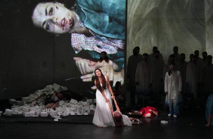 Au lever de rideau, Cassandre (incarnée par la mezzo soprano serbe Katarina Bradic suffocante de véracité dramatique, de beauté vocale et d'implication théâtrale), hurle de désespoir devant le sac de Troie qu'elle avait annoncé sans avoir été entendue. En effet, Apollon (le baryton canadien Joshua Hopkins d'une belle vigueur vocale en total rapport avec le côté noir et prédateur du personnage), pour la séduire l'avait dotée du don de devineresse, mais repoussé, lui a aussitôt craché dans la bouche en la maudissant : personne ne croira jamais ses prophéties.
