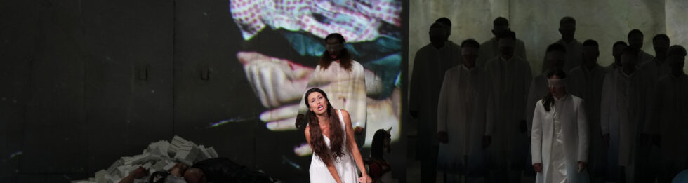 Bruxelles. La Monnaie. 10-IX-2023. Bernard Foccroule (né en 1953) : Cassandra, opéra en un prologue et treize scènes, sur un livret original de Matthew Jocelyn. Mise en scène et vidéos : Marie-Ève Signeyrole. Décors : Fabien Teigné. Costumes : Yashi. Eclairages : Philippe Berthomé. Avec : Katarina Baradic, Cassandra ; Jessica Niles, Sandra ; Susan Bickley, Hecuba/Victoria ; Sarah Defrise, Naomi ; Paul Appleby, Blake ; Joshua Hopkins, Appolo et un membre en colère de l’assistance ; Gidon Saks, Priam/Alexander ; Sandrine Mairesse, Stage Manager/ Marjorie ; Lisa Willems, la présentatrice de la conférence. Chœur de l’Opéra de la Monnaie (direction : Emmanuel Trenque). Orchestre symphonique de la Monnaie, direction : Kasushi Ono