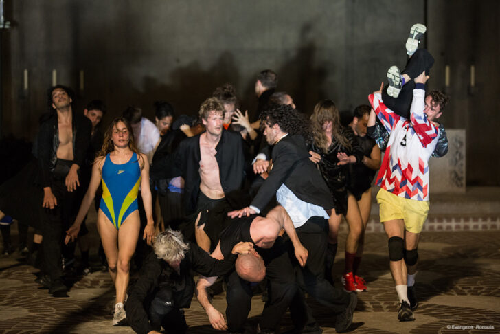 L'acoustique des Usines Fagor se rapproche-t-elle de celle de la cathédrale brutaliste Mariendom à Neviges, près de Wuppertal où Boris Charmatz a créé Liberté Cathédrale le 8 septembre dernier, inaugurant ainsi sa nouvelle direction de la compagnie fondée par Pina Bausch ? Il le vérifie en tout cas en confiant aux danseurs le soin de chanter a cappella (et à l'unisson) le deuxième mouvement de l'Opus 111 de Beethoven (Sonate pour piano n°32), tout en s'appropriant, avec 10 000 gestes (évoquant ainsi son dernier spectacle grand format), le quadrilatère de béton. La clameur semble parfois émaner d'un groupe de supporters de rugby, comme on en voit aujourd'hui dans les rues et les stades de Paris, Marseille, Lyon ou Bordeaux – Coupe du monde de rugby oblige.