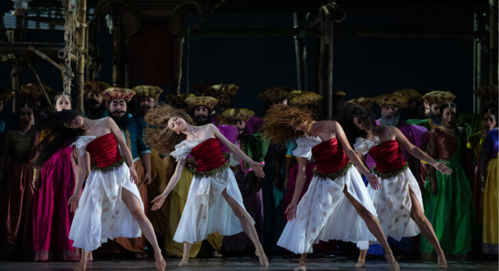 Dans cet Orient fantasmé tout droit sorti d'un conte, Thomas Lebrun choisit judicieusement (et logiquement en qualité d'actuel directeur du Centre chorégraphique national de Tours) d'intégrer largement la danse à cette nouvelle production. C'est avec beaucoup d'humilité et de respect envers le plateau vocal, chœur compris, que le metteur en scène intègre sa vision de l'ouvrage. Le mouvement est principalement orienté vers les danseurs plutôt que vers les chanteurs qui sont disposés face au public avec la volonté constante de mettre en valeur leur chant et faciliter la projection nécessaire à l'appréciation de leur voix. Il est étonnant de constater qu'une direction d'acteurs kitch fonctionne, le spectateur cernant facilement la distance assumée face à cet exotisme de pacotille typique de l'époque. De même, les chorégraphies mêlent les références traditionnelles, qu'elles soient sri-lankaises ou spécifiquement de la danse classique occidentale, tout comme des styles tout aussi hétéroclites que les couleurs des superbes costumes de David Belugou : de Bollywood au french-cancan, il n'y a apparemment qu'un pas que le metteur en scène-chorégraphe franchit avec un naturel désarmant.