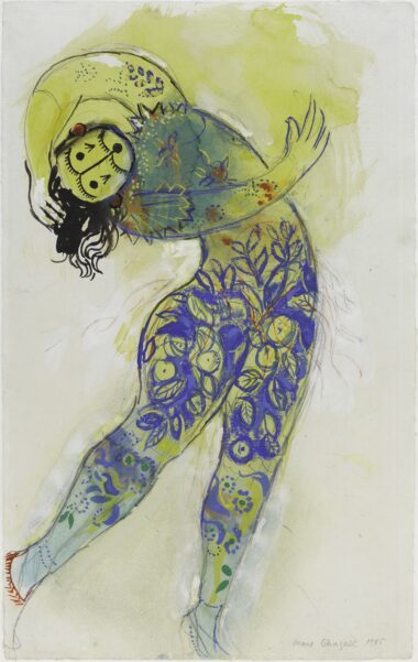 D'emblée on est saisi par le nombre de dessins exposés. Tout un mur présente les esquisses des costumes pour L'Oiseau de feu. À cette époque Chagall vient de perdre sa femme, Bella. C'est une période difficile pour l'artiste profondément déprimé. À New York où il habite, il hésite devant la proposition avant d'accepter, probablement poussé par sa fille Ida, qui collaborera ensuite à la réalisation des costumes. Pourtant, de ces dessins ressortent toute l'exubérance et les couleurs vives de son univers. Influences des folklores mexicains et russes se mêlent, animaux et figures hybrides sont omniprésents, comme ce monstre à tête d'âne. Le trait est en courbe et s'anime, les costumes semblent être déjà en mouvement, pensés pour le ballet, chatoyants et extravagants. En face un autre mur expose les projets de rideaux de fond de scène pour le ballet. Des bleus et verts intenses, des motifs foisonnants, montrent la forêt enchantée. Magnifiques. À côté, on peut voir des photos en noir et blanc du peintre dans son atelier new-yorkais pendant ces dessins préparatoires, également plus loin une très belle Danseuse au voile de 1945 et deux masques d'animaux pour le ballet Aleko (1942) issus d'autres collections.