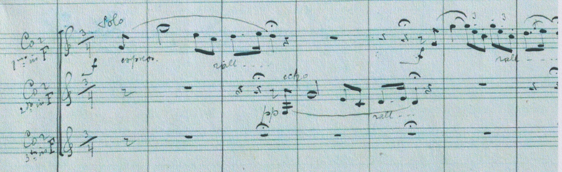 Et la veine helvétique de culminer dans sa Suite Symphonique « Die Alpen » de 1896, une œuvre en partie ampoulée, mais filigrane par d'autres éléments (Lauber devance ici de quelques années la fameuse Symphonie des Alpes de Strauss). Les sous-titres de la suite ne manqueront pas d'éclairer le dernier des non-initiés sur les intentions de l'œuvre : 1. Nostalgie de la montagne – 2. Danse alpestre – 3. Un jour d'été dans la haute-montagne. Pour éviter de donner dans du folklore, Lauber met en œuvre toutes les ressources de l'orchestre symphonique tout en laissant filtrer une fois de plus des éléments de la musique alpine, comme le cor des alpes (Brahms no. 1 oblige !), ici par les cors et leur écho en sourdine :