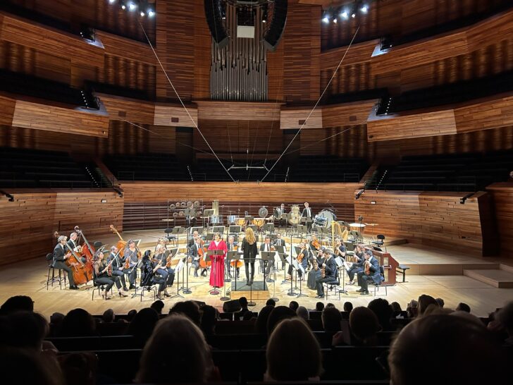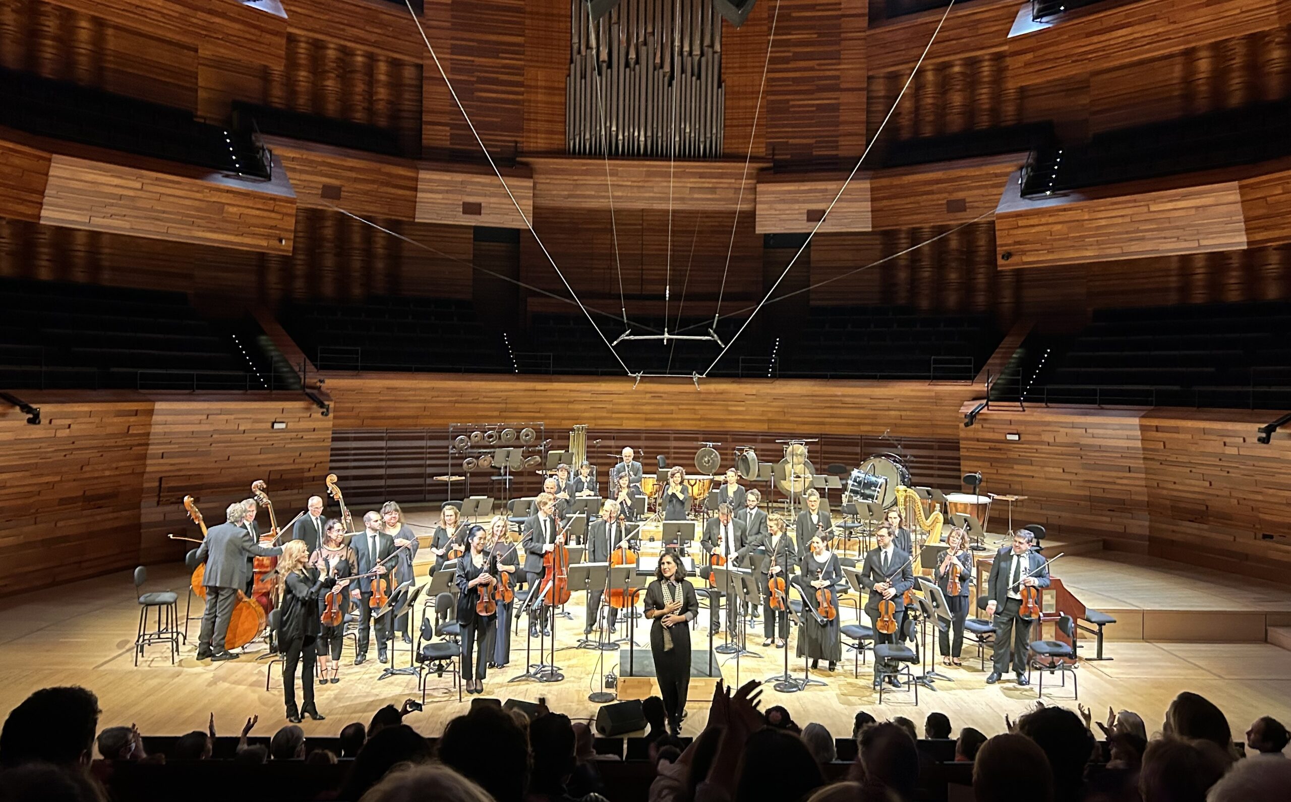 Entrée dans une salle remplie à un petit tiers, ce qui s'explique sans doute par le fait qu'un autre concert du même orchestre a lieu en même temps à la Philharmonie de Paris, Hannigan débute comme cheffe et chanteuse dans une courte création française de Golfam Khayam. Présente pour lire un texte explicatif qui raconte son œuvre, la compositrice iranienne de quarante ans utilise Je ne suis pas une fable à conter pour défendre la bataille des femmes dans son pays, avant que la dédicataire et créatrice de la pièce ne se mette à diriger le Philharmonique en petite formation, puis à se retourner pour chanter en français et en farsi sur une musique en forme de douce déploration, dont le matériau pourrait avoir presque cent ans.