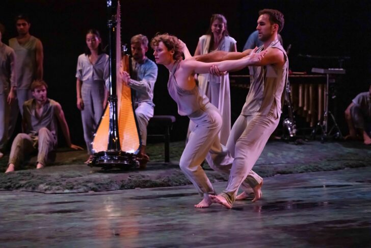 Dans le merveilleux écrin de l'Opéra de Rennes, les spectateurs entrent par les coulisses puis traversent le plateau où danseurs et musiciens s'échauffent déjà, avant de rejoindre leurs fauteuils. Une façon d'abolir le plus possible les frontières, thème cher à Christophe Garcia, qui a souhaité une véritable osmose entre les différents artistes sur scène, tous habillés de la même façon pour marquer un peu plus l'appartenance à une même « meute » selon les termes du chorégraphe. Dans sa mise en scène également, Christophe Garcia revendique le mélange : lumières tamisées, projections, hologrammes brouillent les pistes de ce qui est réel ou ne l'est pas, entre rêve (songe d'une nuit d'été ?) ou réalité. Au cours du spectacle, les musiciens se déplacent sur le plateau et parfois se laissent entraîner dans la course des danseurs, autour de la merveilleuse mezzo-soprano Anna Reinhold qui illumine la pièce de bout en bout par sa présence solaire et la pureté de son chant.