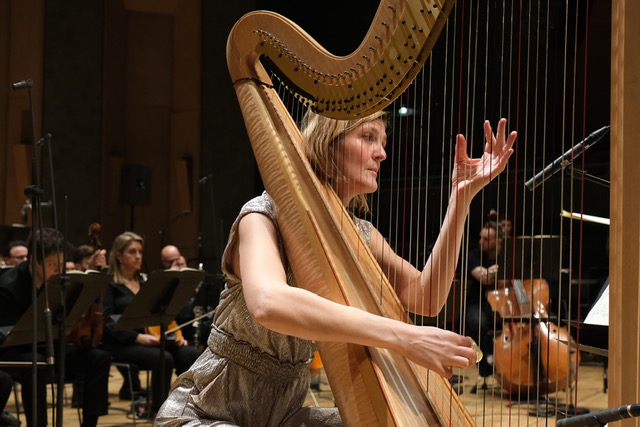 Valeria Kafelnikov joue son instrument d'une main en passant avec l'autre un bottelneck sur les cordes pour en détempérer les hauteurs. Jamais, nous dit-elle, un tel degré de transformation du son n'avait encore été obtenu sur l'instrument ! Étrange également, ce grand unisson des cuivres irradié par les instruments de l'ensemble suivi par une joute de planches de bois exécutée par les percussionnistes avec une énergie sauvage. Samuel Favre, en maître de cérémonie, accroche des accessoires sur un portique et lance du sable dans les rangs des instrumentistes. Inattendue et très réussie, la fin est cut, interrompant brusquement le motif circulaire de la harpe qui commençait à fonctionner en boucle. La pièce interpelle et ne laisse pas indifférent !