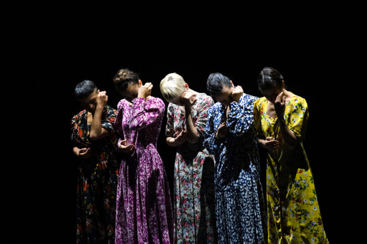 LK : Nous sommes donc cinq femmes sur scène avec une trentaine de robes. J'essaie d'aborder la façon dont on se débrouille aujourd'hui en tant que femme pour se construire, avec tout ce que l'on porte et qui ne nous appartient pas. Toutes les contradictions aussi, les choses que l'on souhaite faire, qu'on croit aimer, etc. Petit à petit, nous allons nous débarrasser de toutes les contraintes. Je me sers des costumes pour exprimer cela. J'adore les costumes, cela aide à voir et à entrer dans le personnage. J'aime également leur côté théâtral. J'ai trouvé les robes du spectacle dans des friperies ; elles ont toutes une histoire et donnent envie de se mouvoir différemment. Je souhaitais qu'elles aient toute quelque chose qui cloche : trop grande, trop petite, trop de fleurs… j'aime que les choses ne soient pas parfaites, quand il y a des failles.