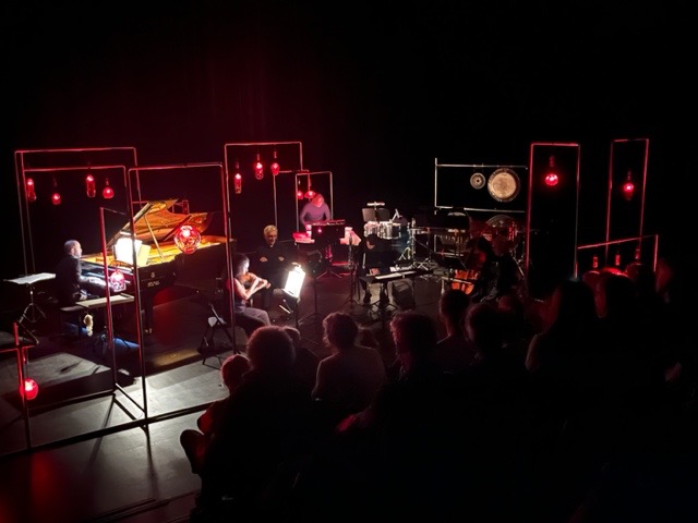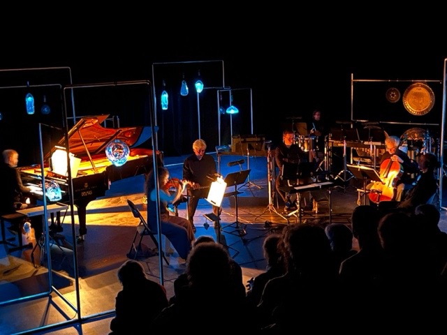 Dans une dominante de bleu, le pianiste Julien Le Pape débute ce « voyage de l'écoute » avec Le Rossignol en amour de Tristan Murail, un bijou écrit il y a peu (2019) par le compositeur qui fait appel aux logiciels d'analyse spectrale pour concevoir ses accords-couleurs et son langage oiseau. Tandis que la lumière réagit aux stimuli sonores, résonne le premier mouvement du Trio de Ravel laissant apprécier la dimension solaire et les couleurs généreuses du violon de Noëmi Schindler tressant ses lignes avec celles du violoncelliste David Simpson. Marc Desmons dirige Oneïron (Rêve) d'Alexandros Markeas, une pièce pour six instrumentistes tout en contrastes dont la seconde période, calme et caressante, dessine ses lignes courbes baignées des résonances du vibraphone de Gianny Pizzolato. Les chants d'oiseaux reviennent sous les doigts de Julien Le Pape avec le Courlis cendré d'Olivier Messiaen, « un grand oiseau au plumage rayé, tacheté de roux jaunâtre et de gris », nous dit le compositeur, qui ajoute ses couleurs à celles de Justine Emard.