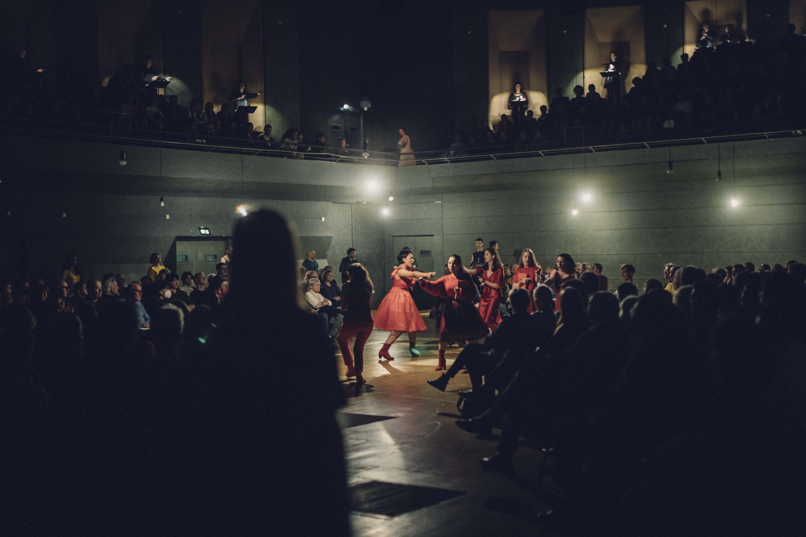 À la Scène 2, Maxime Pascal coordonne toujours les intervenants, mais ne monte sur scène (en robe noire) que pour diriger un court moment, afin d'accorder sept groupes de choristes et un effectif de quatre solistes a capella. Extrêmement mystique, cette scène nous plonge presque dans une approche sectaire de la musique de Stockhausen, auquel on pourrait même trouver un penchant risible, si l'on n'était plongé dans la proposition par la qualité de l'écriture et de la réalisation. Aussi parfaitement préparés que les instrumentistes de la Scène I, les groupes d'Anges du Balcon chantent la Scène II en formant des processions dans les allées étoilées du parterre de la Cité, tandis que sur les quatre côtés du balcon se placent des chanteurs du Chœur Stella Maris, pour créer un tutti choral. Groupe le plus sollicité, les Anges de joie au nombre de quatre mettent en avant la basse Florent Baffi, la soprano Marie Picaut, la mezzo Emmanuelle Monier et le ténor Josue Miranda, sans tenir compte du fait que la soprano et le ténor sont normalement prévus pour Michaël et Ève de la Scène I. Par leurs chants en allemand, anglais, hindi, chinois, espagnol, arabe ou swahili, les groupes parviennent à plonger le public dans la ferveur de la dernière écriture du compositeur, et faire regretter que les scènes suivantes ne soient pas proposées lors d'une seule soirée, jusqu'aux tréfonds de la nuit. (VG)