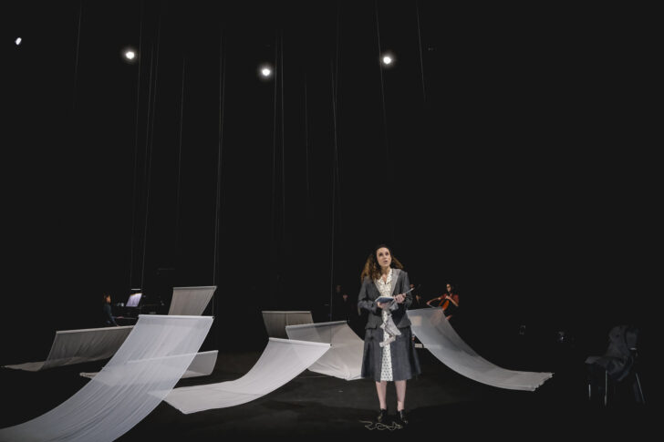 La mise en scène de Mathieu Cruciani, dans le même esprit que le texte et la musique, est d'une simplicité et d'une efficacité remarquables. Quelques voiles blancs rectangulaires, comme des pages du journal en cours d'écriture ou celles des œuvres citées, finement mobiles comme la pensée d'Hélène Berr et transparentes comme son écriture meublent un espace intérieur. Les éclairages se resserrent progressivement sur sa personne, au fur et à mesure que les nouvelles du monde nous enfoncent dans l'horreur des persécutions et que la jeune fille progresse vers l'acceptation de son destin. L'émotion atteint son comble lorsque les musiciens cessent de jouer, et qu'ils nous racontent les derniers jours d'Hélène Berr et sa mort au camp de Bergen-Belsen. Pas de musique pour l'indicible. Rien que le vide, et ce silence apparait comme une quintessence de ce qu'exprimait la musique de Foccroulle. L'après-musique et la parole restent de la musique. Comment applaudir, après un moment pareil ? Le public de Strasbourg remercie néanmoins chaleureusement les interprètes, à commencer par Adèle Charvet, excellente actrice au jeu sobre, digne, et chanteuse valeureuse à la voix de velours, les cordes du Quatuor Béla, commanditaire de l'œuvre, la pianiste agile Jeanne Bleuse et surtout, le compositeur Bernard Foccroulle présent dans la salle lors de cette première strasbourgeoise.