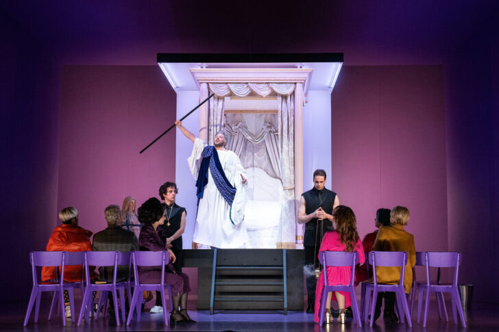 Nous avions laissé le festival baroque organisé par le Théâtre de Heidelberg à Schwetzingen en 2019, avec Alceste de Schürmann, un des compositeurs majeurs de l'Opéra de Hambourg au tournant du XVIIᵉ et du XVIIIᵉ siècle ; nous retrouvons quatre ans plus tard le petit théâtre du château des électeurs palatins pour un autre opéra de Hambourg, Nebukadnezar de Reinhard Keiser, créé en 1704, jamais repris à l'époque moderne jusqu'à aujourd'hui. Comme son titre le laisse deviner, il raconte l'histoire biblique du roi babylonien Nabuchodonosor, sans beaucoup de points communs avec l'opéra de Verdi. Les sujets bibliques ne sont pas très communs à Hambourg, mais celui-là a le mérite d'offrir des scènes spectaculaires, et c'est ce que Keiser recherche. Ce qui reste du sujet biblique n'est rien d'autre que les rêves prémonitoires du roi et leur interprétation par le prophète Daniel ; pour le reste, il s'agit surtout d'intrigues amoureuses typiques du librettiste Christian Friedrich Hunold, que Keiser cessera vite d'employer au profit de librettistes plus percutants.
