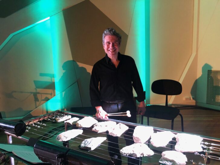 Dans Lithophonic, créé en octobre dernier à la Maison de la Musique de Nanterre, les deux artistes se sont concentrées sur la pierre, matière originelle que Justine Emard façonne et filme et que Lara Morciano fait sonner, s'aidant toutes deux des outils technologiques qui en modèlent les composantes. La première a sélectionné elle-même les pierres des trois lithophones exposés sur le plateau, en fonction de la nature de la roche et ses capacités à résonner. À jardin, les pierres sont suspendues à une structure métallique, variant leur morphologie et leur sonorité. À cour, elles sont disposées, du grave à l'aigu, sur un support aussi léger que possible pour ne pas entraver la résonance. Au centre, trône une stèle qui semble porter des inscriptions, sorte d'objet rituel qui devient instrument de musique lorsqu'on en joue. Sans pause ni applaudissements, ce voyage au cœur de la matière, magnifié par les images de la plasticienne, invite sur la scène six instrumentistes (flûte, saxophone, violon, contrebasse et percussions) sous la direction de Laurent Cuniot ainsi qu'un dispositif d'écoute immersif (six haut-parleurs distribués dans l'espace) que contrôle en direct la compositrice épaulée par le Réalisateur en Informatique Musicale (RIM) José Miguel Fernandez.