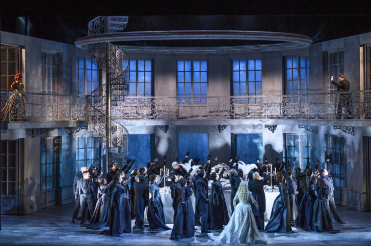 La metteuse en scène grecque, aujourd'hui basée à Londres, signe ainsi une mise en scène très inspirée, dramatiquement très efficace, et choisit de suggérer plutôt que de surligner les divers arrière-plans de l'œuvre par une direction d'acteurs précise et probe, avec des clins d'œil ici et là : le surgissement liminaire des trois nymphes évoque irrésistiblement le prologue de L'Or du Rhin. Avec cet anneau du destin qui sertit l'horizon, la métamorphose de Rusalka en humaine tient plus ironiquement des effets de la chirurgie esthétique que de la potion magique. Ou plus loin au deuxième acte la fureur de la rousse princesse rivale fait songer à Glenn Close en Marquise de Merteuil dans Les Liaisons dangereuses selon Stephen Frears, là où l'agitation du personnel de la Cour librement extraverti rappelle même les comédies musicales de Broadway.