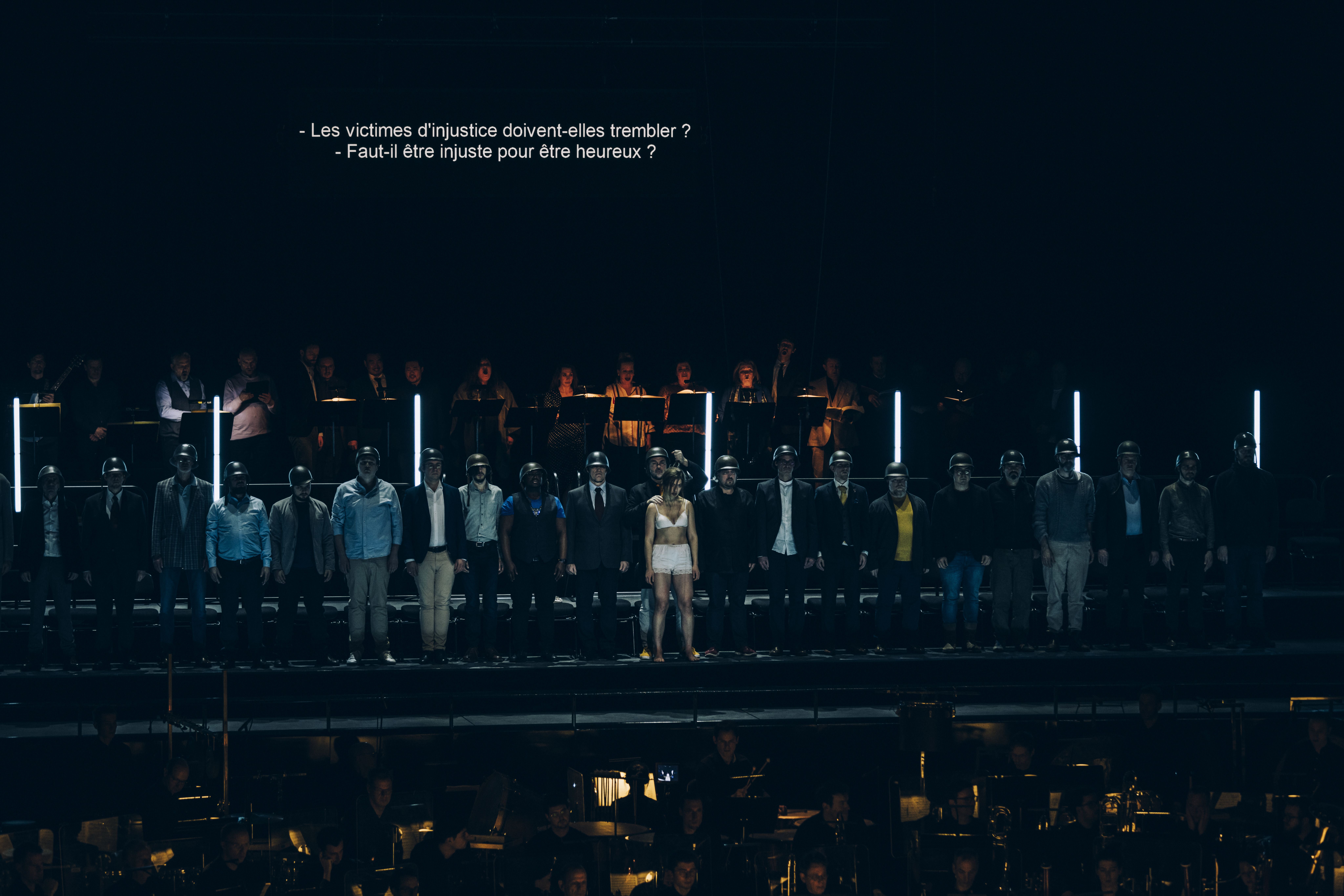 Placés à l'arrière-scène, les chanteurs montent sur une estrade qui n'est pas sans rappeler la proposition de Cologne, mais sur laquelle Bieito réutilise des bribes de sa propre production zurichoise. Alors, plutôt que de mettre l'orchestre en hauteur et laisser l'action scénique à l'avant, il place les chanteurs derrière l'orchestre et réussit surtout les scènes de groupe, dont celles où les soldats entrent au pas. Moins évident à comprendre, surtout si l'on n'a pas les clés de sa mise en scène initiale, il en réutilise des éléments dans sa mise en espace, au risque de laisser à plat certaines idées. Par exemple, dans la scène finale, au lieu d'être aspergée par un plein seau de sang après la scène du viol, le double de Marie se voit juste grimé de quelques traces rouges sur les bras.