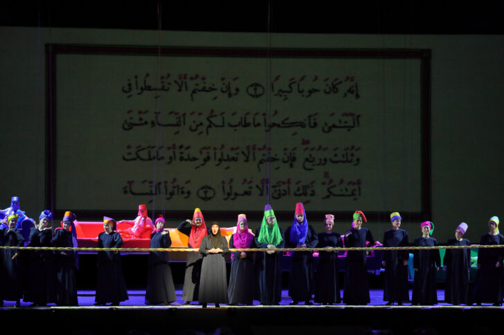 C'est un des grands mérites de la mise en scène de Duncan, précisément, que de mettre à distance, avec une sorte d'ironie indulgente, les aspects problématiques du sujet. Il le fait par l'intermédiaire d'une narratrice (ici Gonca de Haas) qui remplace efficacement les dialogues, en racontant l'histoire et en la situant dans les cours successives du palais de Topkapı à Istanbul, non sans incises en turc. Certes, il n'y a pas vraiment de décor à part les divans de couleur vive qui se balancent depuis les cintres, mais qu'importe : avec ces moyens modestes, Duncan sait raconter une histoire, et de façon suffisamment claire pour que ce spectacle soit utilisé par le Staatsoper comme manière d'amener les enfants à l'opéra.