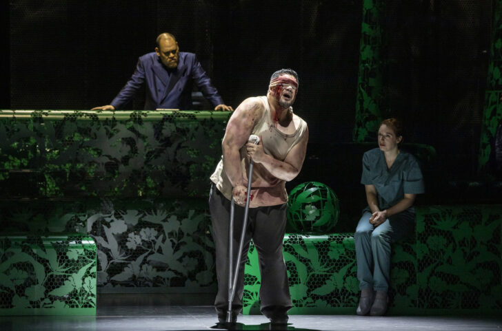 À part dans l’utilisation du chœur, plutôt en place vocalement et souvent entendu en aveugle et en hauteur de l’arrière-scène, puis derrière les balcons, la dramaturgie d’Antonio Cuenca Ruiz se résume à placer les chanteurs en plein centre sur le devant lors de leurs parties les plus importantes. Aucunement plus marquant, les costumes de Camille Assaf ne permettent finalement pas plus d’exprimer la souffrance de Beatrice et Orombello, tous deux torturés pour s’être aimés. La Duchesse reviendra sur scène attachée, dans une bure qui rappelle l’image de Jeanne d’Arc ; le seigneur réapparaîtra en béquille et fauteuil roulant dans des vêtements ensanglantés, bien trop caricaturaux pour créer le moindre effet, sous des lumières de James F. Ingalis, soit blanches et vives, soit rouges et sombres.