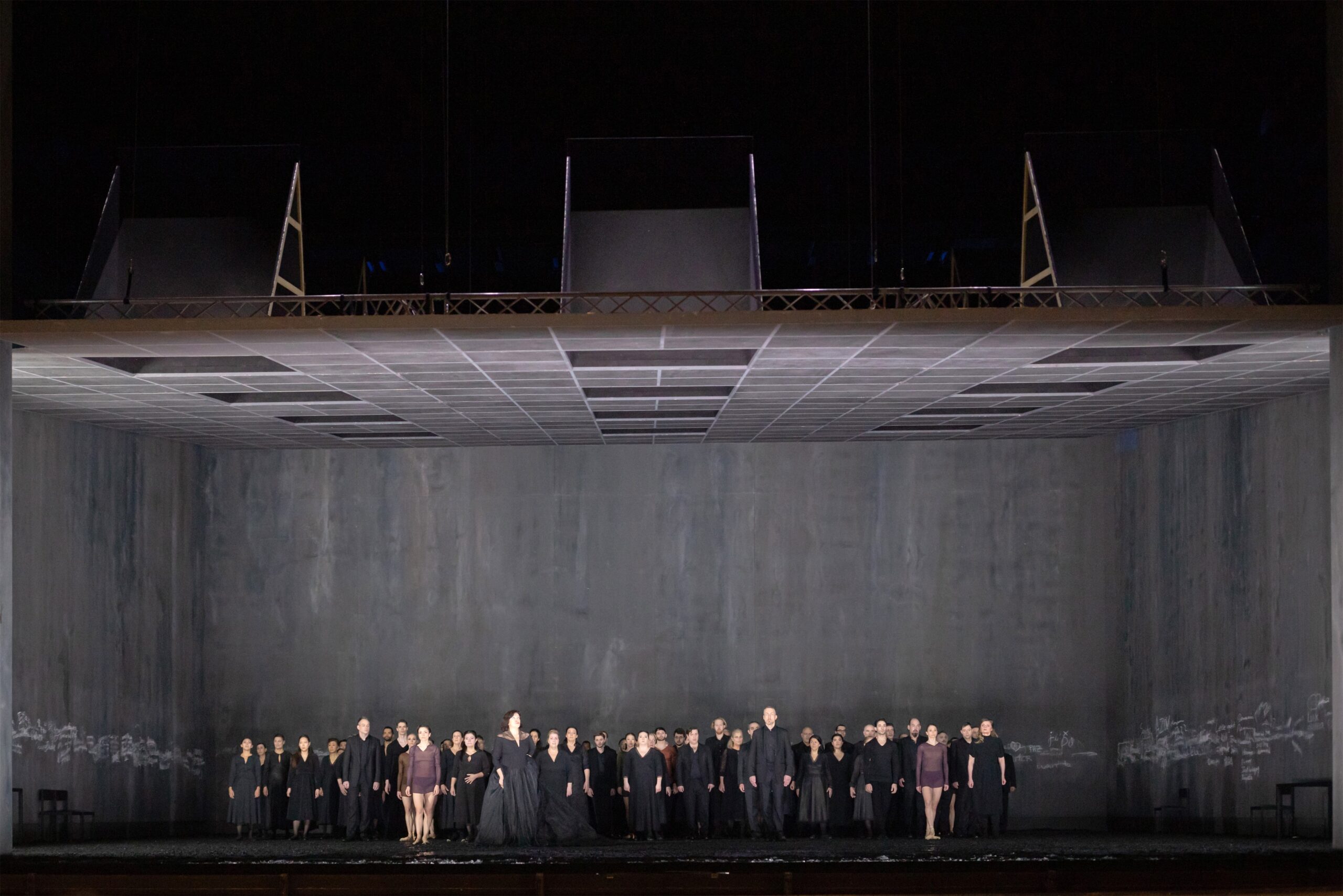 Non seulement le spectacle mobilise les effectifs considérables réclamés par la partition, mais Spuck avait recouru à l'intégralité de la troupe du Ballet de Zurich, solistes comme corps de ballet. Tous sont sur scène : les interactions entre les solistes et les danseurs sont limitées, mais la présence du chœur (pour les moments où il est requis) permet de structurer l'espace, au risque parfois de créer un effet de masse qui n'aide pas les danseurs à capter notre attention.