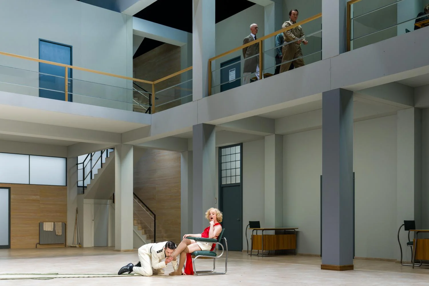 De la fosse au plateau, la partie musicale semble elle aussi chuchoter la partition. Une Cetra de treize instrumentistes sans luxuriance (sans flûtes ni trompettes) accompagne des solistes dont la flamboyance attendue semble elle aussi avoir été enjointe à la confidence dans une atmosphère de conspiration où tous semblent retenir la bête tapie en chacun. La Poppée de Kerstin Avemo affiche du coup une séduction plus froide que d'ordinaire. L'Ottone délicat d'Owen Willetts, la Drusilla fruitée d'Álfheiuður Guðmundsdóttir, le Sénèque un peu éteint d'Andrew Murphy : tout fonctionne. On découvre l'immense (à tous les sens du terme) Arnalta de Stuart Jackson, miel en barre pour Marthaler, ravi de tirer le portrait de ce géant au côté de la Poppée menue d'Avemo. Anne Sofie von Otter, de retour à Bâle, après Winterreise, offre le poids de ses ans à une Ottavia amusante (elle n'est pas pas la dernière à rire à la mort de Sénèque, sommet d'humour marthalerien de la soirée!) et bouleversante : son A Dio, Roma rajoute une pierre à l'édifice des souvenirs d'une maison qui résonne encore de ses flamboyants débuts. Sa vis comica en Valetto à tout faire, squatteur notamment des phrases de l'Amour occis, intronise définitivement Rosemary Hardy, désopilante Ännchen du Freischütz, en icône de l'univers Marthaler. Seconds couteaux, Liberto, Littore et Lucano (respectivement Karl-Heinz Brandt, Jasin Rammal-Rykała et Lulama Taifasi) donnent de leurs personnes en fonctionnaires à tout faire. Quant à la bête immonde, elle trouve en Jake Arditti, moins fou de son corps que son Néron aixois, un idéal de petite frappe mussolinienne.
