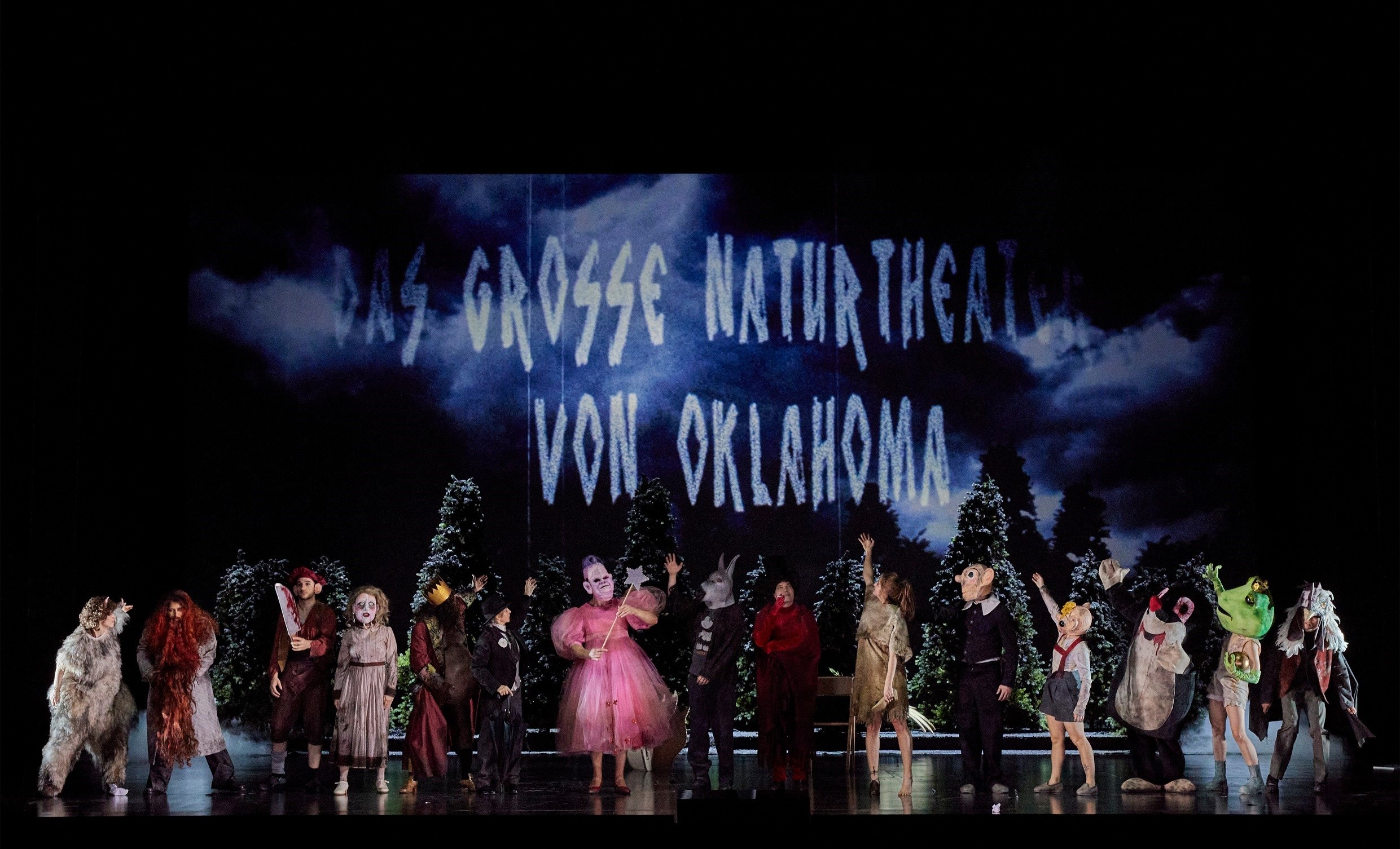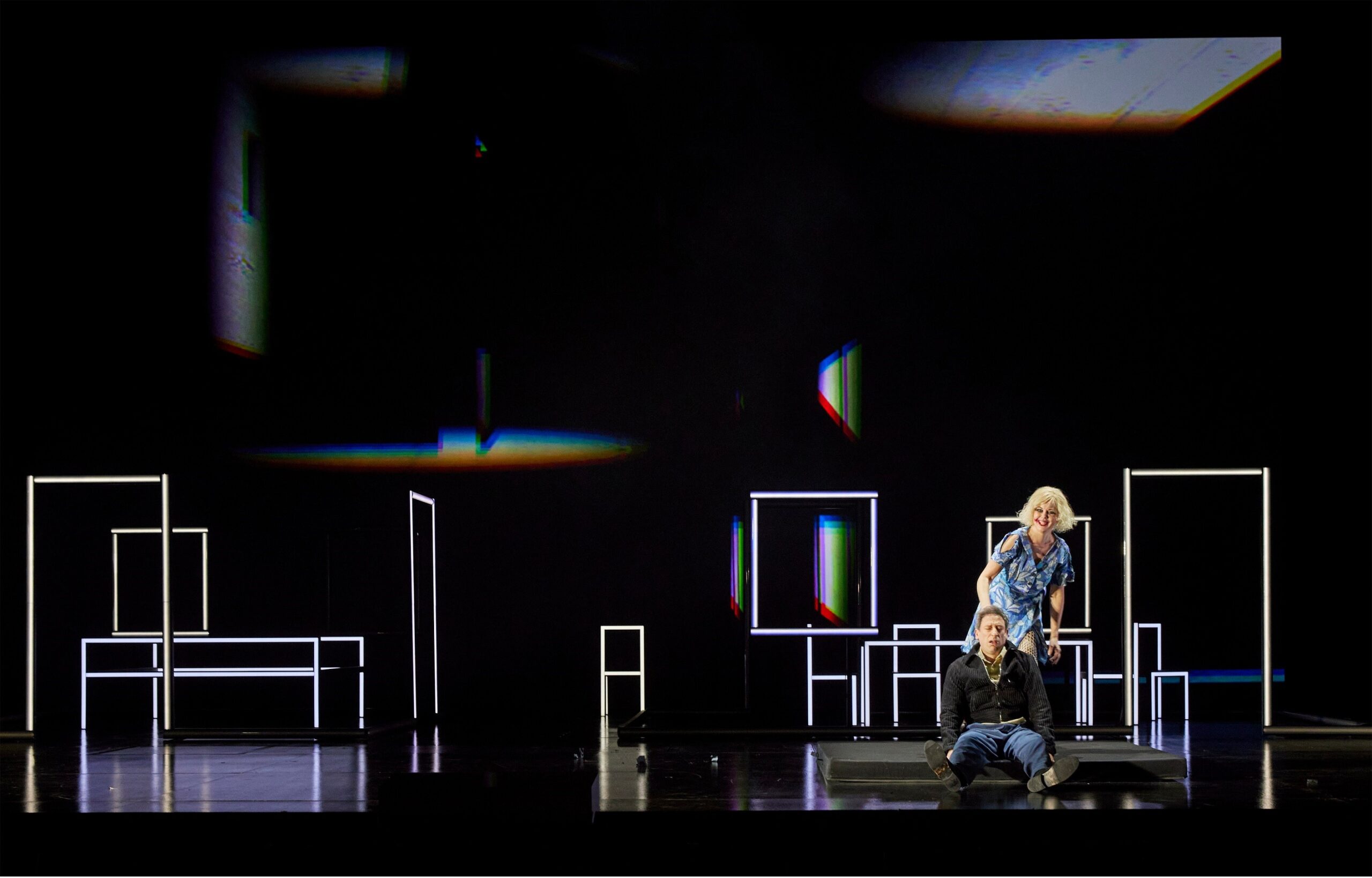 La mise en scène de Sebastian Baumgarten prend grand soin de ne pas tenter de donner une unité artificielle aux images cauchemardesques de Kafka, dont Haubenstock-Ramati renforce encore les discontinuités. La première scène, celle de l'arrivée en Amérique, conserve une forme de réalisme (première photo), les scènes autour de la maison de campagne de Pollunder sont marquées par des néons alternativement blancs et rouges, qui ne font que marquer, de façon abstraite, les angles des fenêtres et de la maison (deuxième photo), tandis que le style devient beaucoup plus exubérant pour l'une des créations les plus étonnantes de Kafka, le Grand Théâtre de l'Oklahoma (troisième photo). La logique du rêve est soulignée par les noirs qui viennent brusquement mettre fin aux différentes scènes – mais cela n'aide visiblement pas la concentration de certains spectateurs. On aurait peut-être aimé un peu plus d'humour, mais Baumgarten contribue ainsi efficacement à la redécouverte de l'œuvre, avec un spectacle divertissant, varié, qui fait ressortir les grandes lignes de l'œuvre.