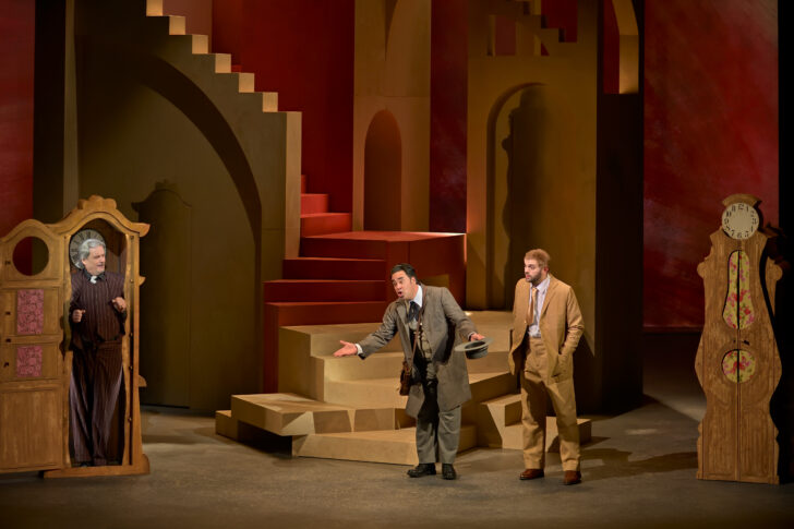 Paris. Opéra Comique. 9-III-2024. Igor Stravinsky (1882-1971) : Pulcinella, ballet avec chant en un acte, d’après Pergolèse. Maurice Ravel (1875-1937) : L’Heure espagnole, comédie musicale en un acte. Livret : Franc-Nohain. Mise en scène : Guillaume Gallienne. Chorégraphie : Clairemarie Osta. Dramaturgie : Marie Lambert-Le Bihan. Décors : Sylvie Olivé. Costumes : Olivier Bériot. Lumières : John Torres. Avec : Oscar Salomonsson, Pulcinella ; Alice Renavand, la Fiancée ; Iván Delgado Del Río, Stoyan Zmarzlik, un homme ; Manon Dubourdeaux, Anna Guillermin, une femme ; Stéphanie d’Oustrac, Concepción, Benoît Rameau, Gonzalve ; Philippe Talbot, Torquemada ; Jean-Sébastien Bou, Ramiro ; Nicolas Cavallier, Don Iñigo Gomez. Artistes de l’Académie de l’Opéra-comique. Orchestre des Champs-Élysées, direction musicale : Louis Langrée