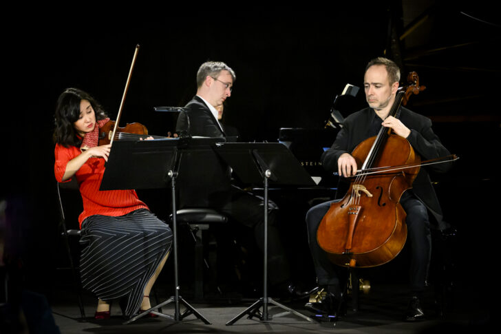 Comme plusieurs autres programmes du festival, l'ordre chronologique est utilisé pour un concert où les ouvrages d'un seul compositeur – en l'occurrence Beethoven – cherchent à créer une sorte de monographie focalisée sur une seule partie du répertoire de l'artiste, ses trio. Le n°1 op.1 n°1 ouvre une soirée refermée par le dernier, n°7 op.97, dans laquelle vient s'intercaler au centre le n°5 op.70 « des Esprits ». Des trois, seul celui central avait déjà été joué ensemble par les musiciens en présence, pourtant d'une belle écoute entre eux dès le n°1 en mi bémol majeur, malgré des différences stylistiques évidentes dans le jeu. déploie avec l'Allegro un geste assuré et agile, qu'il laisse reprendre par le violoncelle chaud d'. Plus discret mais toujours parfaitement associé, le violon de sait qu'il faut dans cette partition laisser le piano diriger, mais convainc totalement par sa finesse à l'Adagio cantabile, puis par sa subtile dextérité au Scherzo.