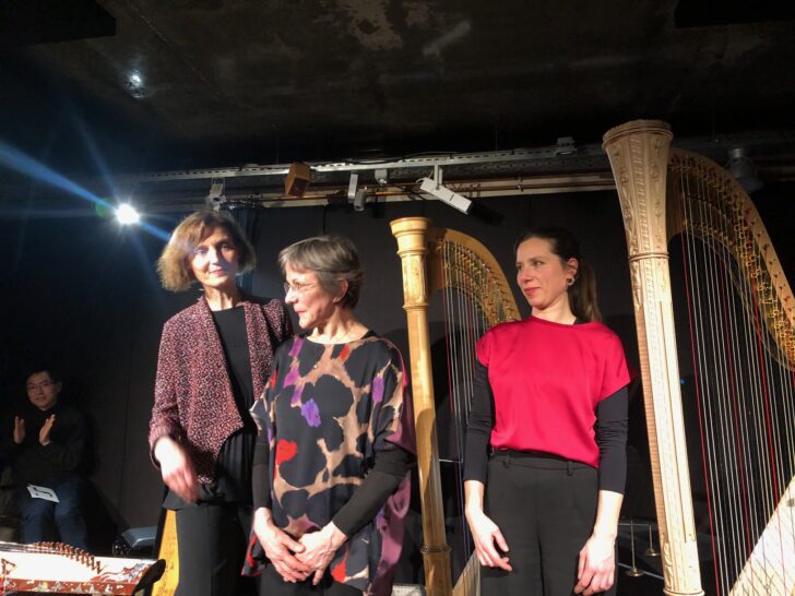 Paris. Galerie 19 Paul Fort. 26-III-2024. Lou Harisson (1917-2003) : Avalokieshvara, pour harpe et petites percussions ; Tôn Thât Tiet (né en 1933) : Hoang Dziep, pour deux harpes ; Escapade, pour trois harpes (CM) ; Attila Reményi (né en 1959) : Obstinate D ; Hommage à G. Kurtag, extraits de Miniatures, pour harpe ; Toshio Hosokawa (né en 1955) : Renka I, pour harpe extrait du cycle Renka I-II-III. Vincent-Raphaël Carinola (né en 1965) : Sanjo, pour deux harpes ; Hélène Breschand (née en 1966) : Au-delà des paupières, l’azur, pour 2 harpes et tranh ; Caroline Lizotte (née en 1969) : Raga pour deux harpes. Élodie Reibaud, Frédérique Cambreling, Laurence Bancaud, harpes